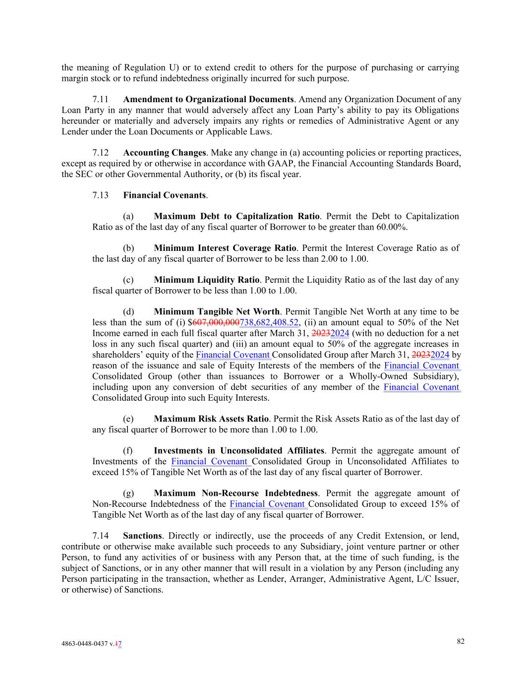 4863-0448-0437 v.17 82 the meaning of Regulation U) or to extend credit to others for the purpose of purchasing or carrying margin stock or to refund indebtedness originally incurred for such purpose. 7.11 Amendment to Organizational Documents. Amend any Organization Document of any Loan Party in any manner that would adversely affect any Loan Party’s ability to pay its Obligations hereunder or materially and adversely impairs any rights or remedies of Administrative Agent or any Lender under the Loan Documents or Applicable Laws. 7.12 Accounting Changes. Make any change in (a) accounting policies or reporting practices, except as required by or otherwise in accordance with GAAP, the Financial Accounting Standards Board, the SEC or other Governmental Authority, or (b) its fiscal year. 7.13 Financial Covenants. (a) Maximum Debt to Capitalization Ratio. Permit the Debt to Capitalization Ratio as of the last day of any fiscal quarter of Borrower to be greater than 60.00%. (b) Minimum Interest Coverage Ratio. Permit the Interest Coverage Ratio as of the last day of any fiscal quarter of Borrower to be less than 2.00 to 1.00. (c) Minimum Liquidity Ratio. Permit the Liquidity Ratio as of the last day of any fiscal quarter of Borrower to be less than 1.00 to 1.00. (d) Minimum Tangible Net Worth. Permit Tangible Net Worth at any time to be less than the sum of (i) $607,000,000738,682,408.52, (ii) an amount equal to 50% of the Net Income earned in each full fiscal quarter after March 31, 20232024 (with no deduction for a net loss in any such fiscal quarter) and (iii) an amount equal to 50% of the aggregate increases in shareholders’ equity of the Financial Covenant Consolidated Group after March 31, 20232024 by reason of the issuance and sale of Equity Interests of the members of the Financial Covenant Consolidated Group (other than issuances to Borrower or a Wholly-Owned Subsidiary), including upon any conversion of debt securities of any member of the Financial Covenant Consolidated Group into such Equity Interests. (e) Maximum Risk Assets Ratio. Permit the Risk Assets Ratio as of the last day of any fiscal quarter of Borrower to be more than 1.00 to 1.00. (f) Investments in Unconsolidated Affiliates. Permit the aggregate amount of Investments of the Financial Covenant Consolidated Group in Unconsolidated Affiliates to exceed 15% of Tangible Net Worth as of the last day of any fiscal quarter of Borrower. (g) Maximum Non-Recourse Indebtedness. Permit the aggregate amount of Non-Recourse Indebtedness of the Financial Covenant Consolidated Group to exceed 15% of Tangible Net Worth as of the last day of any fiscal quarter of Borrower. 7.14 Sanctions. Directly or indirectly, use the proceeds of any Credit Extension, or lend, contribute or otherwise make available such proceeds to any Subsidiary, joint venture partner or other Person, to fund any activities of or business with any Person that, at the time of such funding, is the subject of Sanctions, or in any other manner that will result in a violation by any Person (including any Person participating in the transaction, whether as Lender, Arranger, Administrative Agent, L/C Issuer, or otherwise) of Sanctions.