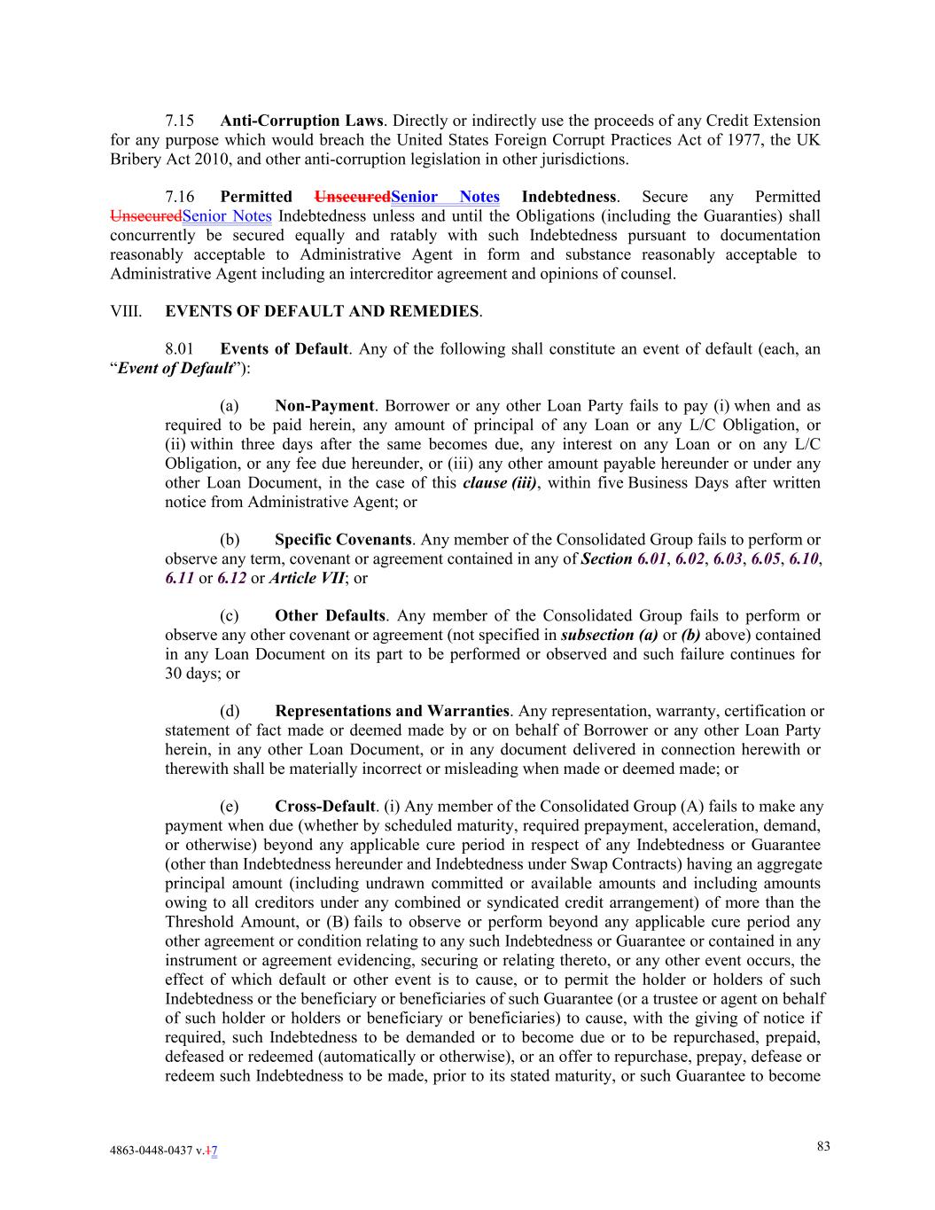 4863-0448-0437 v.17 83 7.15 Anti-Corruption Laws. Directly or indirectly use the proceeds of any Credit Extension for any purpose which would breach the United States Foreign Corrupt Practices Act of 1977, the UK Bribery Act 2010, and other anti-corruption legislation in other jurisdictions. 7.16 Permitted UnsecuredSenior Notes Indebtedness. Secure any Permitted UnsecuredSenior Notes Indebtedness unless and until the Obligations (including the Guaranties) shall concurrently be secured equally and ratably with such Indebtedness pursuant to documentation reasonably acceptable to Administrative Agent in form and substance reasonably acceptable to Administrative Agent including an intercreditor agreement and opinions of counsel. VIII. EVENTS OF DEFAULT AND REMEDIES. 8.01 Events of Default. Any of the following shall constitute an event of default (each, an “Event of Default”): (a) Non-Payment. Borrower or any other Loan Party fails to pay (i) when and as required to be paid herein, any amount of principal of any Loan or any L/C Obligation, or (ii) within three days after the same becomes due, any interest on any Loan or on any L/C Obligation, or any fee due hereunder, or (iii) any other amount payable hereunder or under any other Loan Document, in the case of this clause (iii), within five Business Days after written notice from Administrative Agent; or (b) Specific Covenants. Any member of the Consolidated Group fails to perform or observe any term, covenant or agreement contained in any of Section 6.01, 6.02, 6.03, 6.05, 6.10, 6.11 or 6.12 or Article VII; or (c) Other Defaults. Any member of the Consolidated Group fails to perform or observe any other covenant or agreement (not specified in subsection (a) or (b) above) contained in any Loan Document on its part to be performed or observed and such failure continues for 30 days; or (d) Representations and Warranties. Any representation, warranty, certification or statement of fact made or deemed made by or on behalf of Borrower or any other Loan Party herein, in any other Loan Document, or in any document delivered in connection herewith or therewith shall be materially incorrect or misleading when made or deemed made; or (e) Cross-Default. (i) Any member of the Consolidated Group (A) fails to make any payment when due (whether by scheduled maturity, required prepayment, acceleration, demand, or otherwise) beyond any applicable cure period in respect of any Indebtedness or Guarantee (other than Indebtedness hereunder and Indebtedness under Swap Contracts) having an aggregate principal amount (including undrawn committed or available amounts and including amounts owing to all creditors under any combined or syndicated credit arrangement) of more than the Threshold Amount, or (B) fails to observe or perform beyond any applicable cure period any other agreement or condition relating to any such Indebtedness or Guarantee or contained in any instrument or agreement evidencing, securing or relating thereto, or any other event occurs, the effect of which default or other event is to cause, or to permit the holder or holders of such Indebtedness or the beneficiary or beneficiaries of such Guarantee (or a trustee or agent on behalf of such holder or holders or beneficiary or beneficiaries) to cause, with the giving of notice if required, such Indebtedness to be demanded or to become due or to be repurchased, prepaid, defeased or redeemed (automatically or otherwise), or an offer to repurchase, prepay, defease or redeem such Indebtedness to be made, prior to its stated maturity, or such Guarantee to become