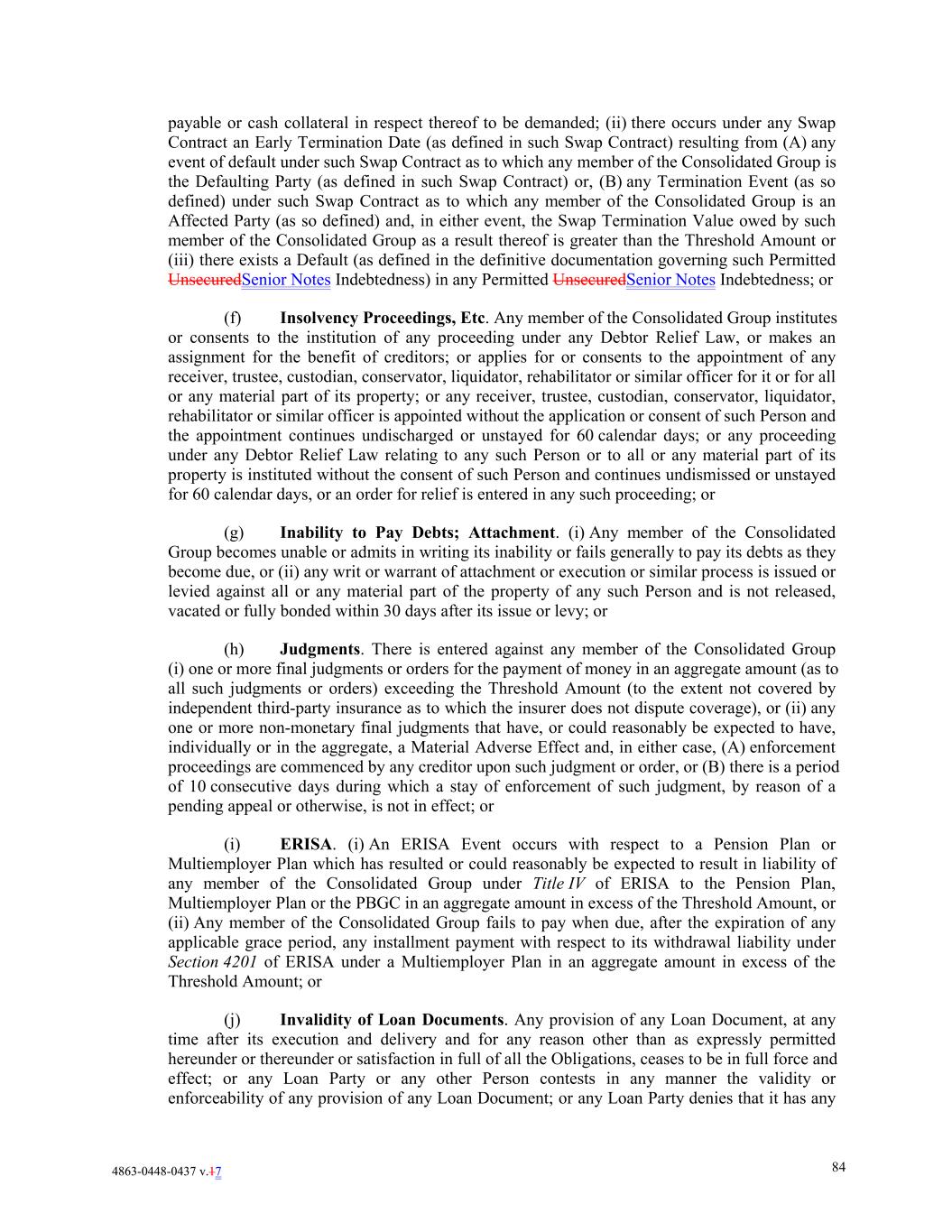 4863-0448-0437 v.17 84 payable or cash collateral in respect thereof to be demanded; (ii) there occurs under any Swap Contract an Early Termination Date (as defined in such Swap Contract) resulting from (A) any event of default under such Swap Contract as to which any member of the Consolidated Group is the Defaulting Party (as defined in such Swap Contract) or, (B) any Termination Event (as so defined) under such Swap Contract as to which any member of the Consolidated Group is an Affected Party (as so defined) and, in either event, the Swap Termination Value owed by such member of the Consolidated Group as a result thereof is greater than the Threshold Amount or (iii) there exists a Default (as defined in the definitive documentation governing such Permitted UnsecuredSenior Notes Indebtedness) in any Permitted UnsecuredSenior Notes Indebtedness; or (f) Insolvency Proceedings, Etc. Any member of the Consolidated Group institutes or consents to the institution of any proceeding under any Debtor Relief Law, or makes an assignment for the benefit of creditors; or applies for or consents to the appointment of any receiver, trustee, custodian, conservator, liquidator, rehabilitator or similar officer for it or for all or any material part of its property; or any receiver, trustee, custodian, conservator, liquidator, rehabilitator or similar officer is appointed without the application or consent of such Person and the appointment continues undischarged or unstayed for 60 calendar days; or any proceeding under any Debtor Relief Law relating to any such Person or to all or any material part of its property is instituted without the consent of such Person and continues undismissed or unstayed for 60 calendar days, or an order for relief is entered in any such proceeding; or (g) Inability to Pay Debts; Attachment. (i) Any member of the Consolidated Group becomes unable or admits in writing its inability or fails generally to pay its debts as they become due, or (ii) any writ or warrant of attachment or execution or similar process is issued or levied against all or any material part of the property of any such Person and is not released, vacated or fully bonded within 30 days after its issue or levy; or (h) Judgments. There is entered against any member of the Consolidated Group (i) one or more final judgments or orders for the payment of money in an aggregate amount (as to all such judgments or orders) exceeding the Threshold Amount (to the extent not covered by independent third-party insurance as to which the insurer does not dispute coverage), or (ii) any one or more non-monetary final judgments that have, or could reasonably be expected to have, individually or in the aggregate, a Material Adverse Effect and, in either case, (A) enforcement proceedings are commenced by any creditor upon such judgment or order, or (B) there is a period of 10 consecutive days during which a stay of enforcement of such judgment, by reason of a pending appeal or otherwise, is not in effect; or (i) ERISA. (i) An ERISA Event occurs with respect to a Pension Plan or Multiemployer Plan which has resulted or could reasonably be expected to result in liability of any member of the Consolidated Group under Title IV of ERISA to the Pension Plan, Multiemployer Plan or the PBGC in an aggregate amount in excess of the Threshold Amount, or (ii) Any member of the Consolidated Group fails to pay when due, after the expiration of any applicable grace period, any installment payment with respect to its withdrawal liability under Section 4201 of ERISA under a Multiemployer Plan in an aggregate amount in excess of the Threshold Amount; or (j) Invalidity of Loan Documents. Any provision of any Loan Document, at any time after its execution and delivery and for any reason other than as expressly permitted hereunder or thereunder or satisfaction in full of all the Obligations, ceases to be in full force and effect; or any Loan Party or any other Person contests in any manner the validity or enforceability of any provision of any Loan Document; or any Loan Party denies that it has any