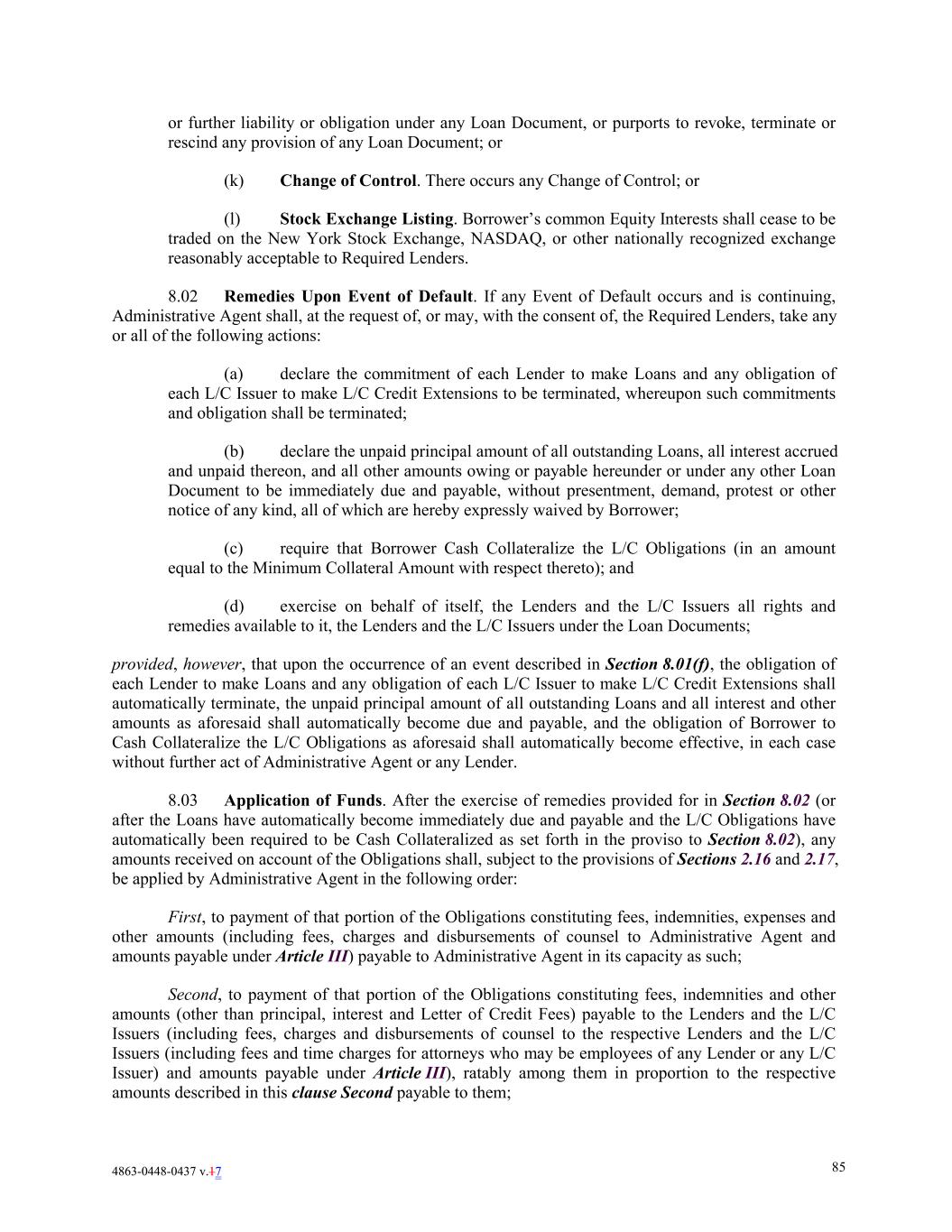 4863-0448-0437 v.17 85 or further liability or obligation under any Loan Document, or purports to revoke, terminate or rescind any provision of any Loan Document; or (k) Change of Control. There occurs any Change of Control; or (l) Stock Exchange Listing. Borrower’s common Equity Interests shall cease to be traded on the New York Stock Exchange, NASDAQ, or other nationally recognized exchange reasonably acceptable to Required Lenders. 8.02 Remedies Upon Event of Default. If any Event of Default occurs and is continuing, Administrative Agent shall, at the request of, or may, with the consent of, the Required Lenders, take any or all of the following actions: (a) declare the commitment of each Lender to make Loans and any obligation of each L/C Issuer to make L/C Credit Extensions to be terminated, whereupon such commitments and obligation shall be terminated; (b) declare the unpaid principal amount of all outstanding Loans, all interest accrued and unpaid thereon, and all other amounts owing or payable hereunder or under any other Loan Document to be immediately due and payable, without presentment, demand, protest or other notice of any kind, all of which are hereby expressly waived by Borrower; (c) require that Borrower Cash Collateralize the L/C Obligations (in an amount equal to the Minimum Collateral Amount with respect thereto); and (d) exercise on behalf of itself, the Lenders and the L/C Issuers all rights and remedies available to it, the Lenders and the L/C Issuers under the Loan Documents; provided, however, that upon the occurrence of an event described in Section 8.01(f), the obligation of each Lender to make Loans and any obligation of each L/C Issuer to make L/C Credit Extensions shall automatically terminate, the unpaid principal amount of all outstanding Loans and all interest and other amounts as aforesaid shall automatically become due and payable, and the obligation of Borrower to Cash Collateralize the L/C Obligations as aforesaid shall automatically become effective, in each case without further act of Administrative Agent or any Lender. 8.03 Application of Funds. After the exercise of remedies provided for in Section 8.02 (or after the Loans have automatically become immediately due and payable and the L/C Obligations have automatically been required to be Cash Collateralized as set forth in the proviso to Section 8.02), any amounts received on account of the Obligations shall, subject to the provisions of Sections 2.16 and 2.17, be applied by Administrative Agent in the following order: First, to payment of that portion of the Obligations constituting fees, indemnities, expenses and other amounts (including fees, charges and disbursements of counsel to Administrative Agent and amounts payable under Article III) payable to Administrative Agent in its capacity as such; Second, to payment of that portion of the Obligations constituting fees, indemnities and other amounts (other than principal, interest and Letter of Credit Fees) payable to the Lenders and the L/C Issuers (including fees, charges and disbursements of counsel to the respective Lenders and the L/C Issuers (including fees and time charges for attorneys who may be employees of any Lender or any L/C Issuer) and amounts payable under Article III), ratably among them in proportion to the respective amounts described in this clause Second payable to them;