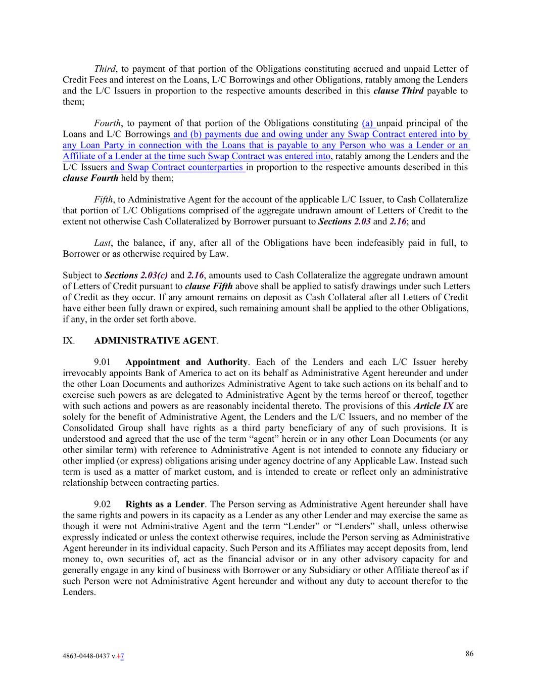 4863-0448-0437 v.17 86 Third, to payment of that portion of the Obligations constituting accrued and unpaid Letter of Credit Fees and interest on the Loans, L/C Borrowings and other Obligations, ratably among the Lenders and the L/C Issuers in proportion to the respective amounts described in this clause Third payable to them; Fourth, to payment of that portion of the Obligations constituting (a) unpaid principal of the Loans and L/C Borrowings and (b) payments due and owing under any Swap Contract entered into by any Loan Party in connection with the Loans that is payable to any Person who was a Lender or an Affiliate of a Lender at the time such Swap Contract was entered into, ratably among the Lenders and the L/C Issuers and Swap Contract counterparties in proportion to the respective amounts described in this clause Fourth held by them; Fifth, to Administrative Agent for the account of the applicable L/C Issuer, to Cash Collateralize that portion of L/C Obligations comprised of the aggregate undrawn amount of Letters of Credit to the extent not otherwise Cash Collateralized by Borrower pursuant to Sections 2.03 and 2.16; and Last, the balance, if any, after all of the Obligations have been indefeasibly paid in full, to Borrower or as otherwise required by Law. Subject to Sections 2.03(c) and 2.16, amounts used to Cash Collateralize the aggregate undrawn amount of Letters of Credit pursuant to clause Fifth above shall be applied to satisfy drawings under such Letters of Credit as they occur. If any amount remains on deposit as Cash Collateral after all Letters of Credit have either been fully drawn or expired, such remaining amount shall be applied to the other Obligations, if any, in the order set forth above. IX. ADMINISTRATIVE AGENT. 9.01 Appointment and Authority. Each of the Lenders and each L/C Issuer hereby irrevocably appoints Bank of America to act on its behalf as Administrative Agent hereunder and under the other Loan Documents and authorizes Administrative Agent to take such actions on its behalf and to exercise such powers as are delegated to Administrative Agent by the terms hereof or thereof, together with such actions and powers as are reasonably incidental thereto. The provisions of this Article IX are solely for the benefit of Administrative Agent, the Lenders and the L/C Issuers, and no member of the Consolidated Group shall have rights as a third party beneficiary of any of such provisions. It is understood and agreed that the use of the term “agent” herein or in any other Loan Documents (or any other similar term) with reference to Administrative Agent is not intended to connote any fiduciary or other implied (or express) obligations arising under agency doctrine of any Applicable Law. Instead such term is used as a matter of market custom, and is intended to create or reflect only an administrative relationship between contracting parties. 9.02 Rights as a Lender. The Person serving as Administrative Agent hereunder shall have the same rights and powers in its capacity as a Lender as any other Lender and may exercise the same as though it were not Administrative Agent and the term “Lender” or “Lenders” shall, unless otherwise expressly indicated or unless the context otherwise requires, include the Person serving as Administrative Agent hereunder in its individual capacity. Such Person and its Affiliates may accept deposits from, lend money to, own securities of, act as the financial advisor or in any other advisory capacity for and generally engage in any kind of business with Borrower or any Subsidiary or other Affiliate thereof as if such Person were not Administrative Agent hereunder and without any duty to account therefor to the Lenders.