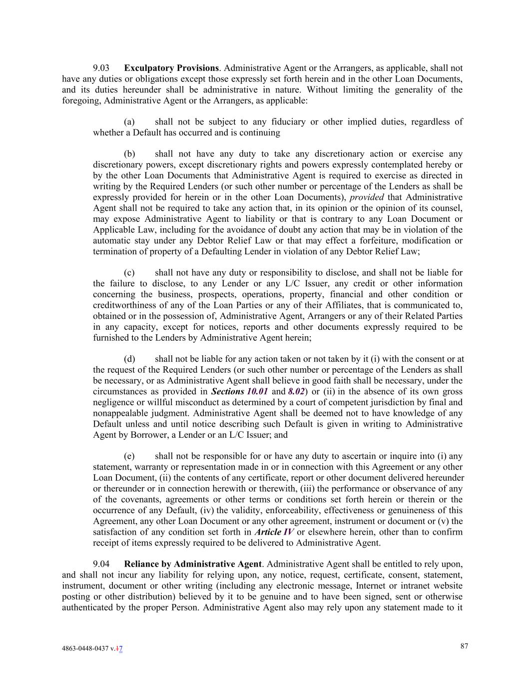 4863-0448-0437 v.17 87 9.03 Exculpatory Provisions. Administrative Agent or the Arrangers, as applicable, shall not have any duties or obligations except those expressly set forth herein and in the other Loan Documents, and its duties hereunder shall be administrative in nature. Without limiting the generality of the foregoing, Administrative Agent or the Arrangers, as applicable: (a) shall not be subject to any fiduciary or other implied duties, regardless of whether a Default has occurred and is continuing (b) shall not have any duty to take any discretionary action or exercise any discretionary powers, except discretionary rights and powers expressly contemplated hereby or by the other Loan Documents that Administrative Agent is required to exercise as directed in writing by the Required Lenders (or such other number or percentage of the Lenders as shall be expressly provided for herein or in the other Loan Documents), provided that Administrative Agent shall not be required to take any action that, in its opinion or the opinion of its counsel, may expose Administrative Agent to liability or that is contrary to any Loan Document or Applicable Law, including for the avoidance of doubt any action that may be in violation of the automatic stay under any Debtor Relief Law or that may effect a forfeiture, modification or termination of property of a Defaulting Lender in violation of any Debtor Relief Law; (c) shall not have any duty or responsibility to disclose, and shall not be liable for the failure to disclose, to any Lender or any L/C Issuer, any credit or other information concerning the business, prospects, operations, property, financial and other condition or creditworthiness of any of the Loan Parties or any of their Affiliates, that is communicated to, obtained or in the possession of, Administrative Agent, Arrangers or any of their Related Parties in any capacity, except for notices, reports and other documents expressly required to be furnished to the Lenders by Administrative Agent herein; (d) shall not be liable for any action taken or not taken by it (i) with the consent or at the request of the Required Lenders (or such other number or percentage of the Lenders as shall be necessary, or as Administrative Agent shall believe in good faith shall be necessary, under the circumstances as provided in Sections 10.01 and 8.02) or (ii) in the absence of its own gross negligence or willful misconduct as determined by a court of competent jurisdiction by final and nonappealable judgment. Administrative Agent shall be deemed not to have knowledge of any Default unless and until notice describing such Default is given in writing to Administrative Agent by Borrower, a Lender or an L/C Issuer; and (e) shall not be responsible for or have any duty to ascertain or inquire into (i) any statement, warranty or representation made in or in connection with this Agreement or any other Loan Document, (ii) the contents of any certificate, report or other document delivered hereunder or thereunder or in connection herewith or therewith, (iii) the performance or observance of any of the covenants, agreements or other terms or conditions set forth herein or therein or the occurrence of any Default, (iv) the validity, enforceability, effectiveness or genuineness of this Agreement, any other Loan Document or any other agreement, instrument or document or (v) the satisfaction of any condition set forth in Article IV or elsewhere herein, other than to confirm receipt of items expressly required to be delivered to Administrative Agent. 9.04 Reliance by Administrative Agent. Administrative Agent shall be entitled to rely upon, and shall not incur any liability for relying upon, any notice, request, certificate, consent, statement, instrument, document or other writing (including any electronic message, Internet or intranet website posting or other distribution) believed by it to be genuine and to have been signed, sent or otherwise authenticated by the proper Person. Administrative Agent also may rely upon any statement made to it
