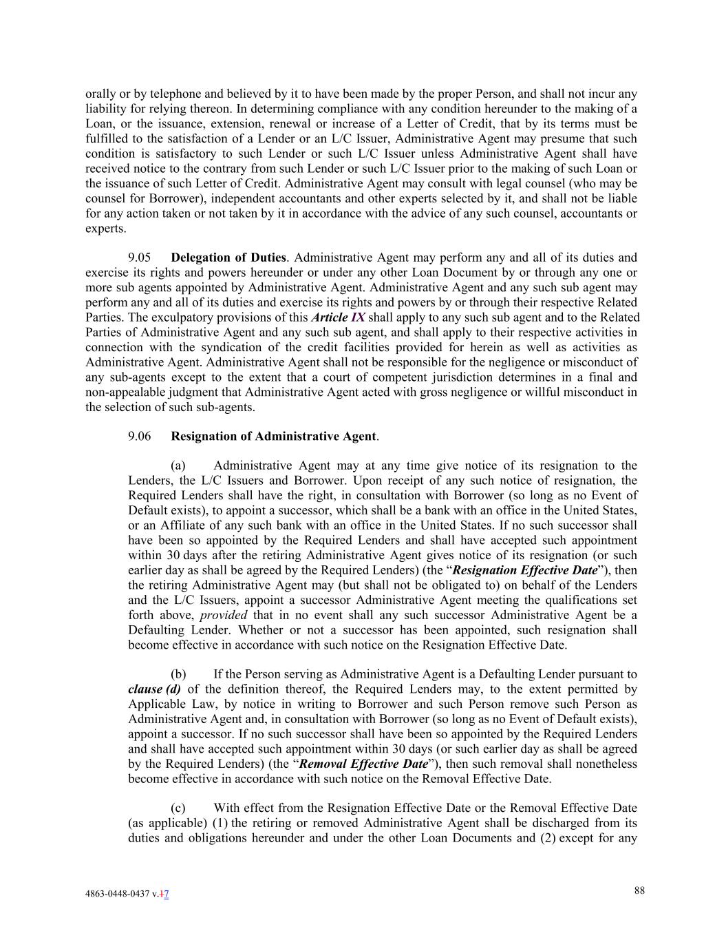 4863-0448-0437 v.17 88 orally or by telephone and believed by it to have been made by the proper Person, and shall not incur any liability for relying thereon. In determining compliance with any condition hereunder to the making of a Loan, or the issuance, extension, renewal or increase of a Letter of Credit, that by its terms must be fulfilled to the satisfaction of a Lender or an L/C Issuer, Administrative Agent may presume that such condition is satisfactory to such Lender or such L/C Issuer unless Administrative Agent shall have received notice to the contrary from such Lender or such L/C Issuer prior to the making of such Loan or the issuance of such Letter of Credit. Administrative Agent may consult with legal counsel (who may be counsel for Borrower), independent accountants and other experts selected by it, and shall not be liable for any action taken or not taken by it in accordance with the advice of any such counsel, accountants or experts. 9.05 Delegation of Duties. Administrative Agent may perform any and all of its duties and exercise its rights and powers hereunder or under any other Loan Document by or through any one or more sub agents appointed by Administrative Agent. Administrative Agent and any such sub agent may perform any and all of its duties and exercise its rights and powers by or through their respective Related Parties. The exculpatory provisions of this Article IX shall apply to any such sub agent and to the Related Parties of Administrative Agent and any such sub agent, and shall apply to their respective activities in connection with the syndication of the credit facilities provided for herein as well as activities as Administrative Agent. Administrative Agent shall not be responsible for the negligence or misconduct of any sub-agents except to the extent that a court of competent jurisdiction determines in a final and non-appealable judgment that Administrative Agent acted with gross negligence or willful misconduct in the selection of such sub-agents. 9.06 Resignation of Administrative Agent. (a) Administrative Agent may at any time give notice of its resignation to the Lenders, the L/C Issuers and Borrower. Upon receipt of any such notice of resignation, the Required Lenders shall have the right, in consultation with Borrower (so long as no Event of Default exists), to appoint a successor, which shall be a bank with an office in the United States, or an Affiliate of any such bank with an office in the United States. If no such successor shall have been so appointed by the Required Lenders and shall have accepted such appointment within 30 days after the retiring Administrative Agent gives notice of its resignation (or such earlier day as shall be agreed by the Required Lenders) (the “Resignation Effective Date”), then the retiring Administrative Agent may (but shall not be obligated to) on behalf of the Lenders and the L/C Issuers, appoint a successor Administrative Agent meeting the qualifications set forth above, provided that in no event shall any such successor Administrative Agent be a Defaulting Lender. Whether or not a successor has been appointed, such resignation shall become effective in accordance with such notice on the Resignation Effective Date. (b) If the Person serving as Administrative Agent is a Defaulting Lender pursuant to clause (d) of the definition thereof, the Required Lenders may, to the extent permitted by Applicable Law, by notice in writing to Borrower and such Person remove such Person as Administrative Agent and, in consultation with Borrower (so long as no Event of Default exists), appoint a successor. If no such successor shall have been so appointed by the Required Lenders and shall have accepted such appointment within 30 days (or such earlier day as shall be agreed by the Required Lenders) (the “Removal Effective Date”), then such removal shall nonetheless become effective in accordance with such notice on the Removal Effective Date. (c) With effect from the Resignation Effective Date or the Removal Effective Date (as applicable) (1) the retiring or removed Administrative Agent shall be discharged from its duties and obligations hereunder and under the other Loan Documents and (2) except for any