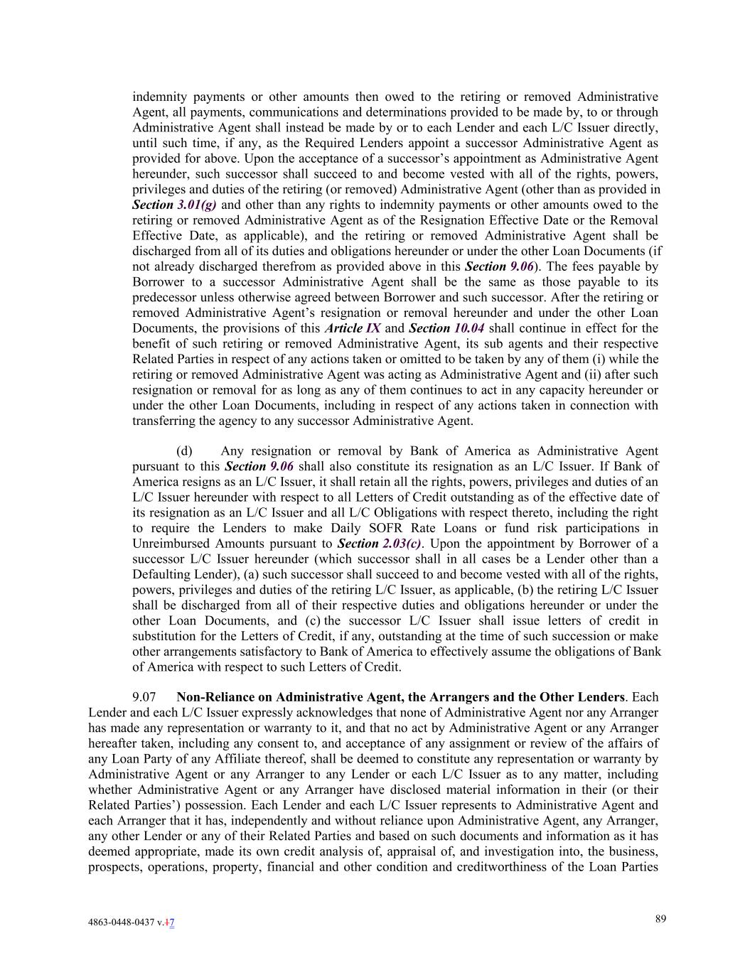 4863-0448-0437 v.17 89 indemnity payments or other amounts then owed to the retiring or removed Administrative Agent, all payments, communications and determinations provided to be made by, to or through Administrative Agent shall instead be made by or to each Lender and each L/C Issuer directly, until such time, if any, as the Required Lenders appoint a successor Administrative Agent as provided for above. Upon the acceptance of a successor’s appointment as Administrative Agent hereunder, such successor shall succeed to and become vested with all of the rights, powers, privileges and duties of the retiring (or removed) Administrative Agent (other than as provided in Section 3.01(g) and other than any rights to indemnity payments or other amounts owed to the retiring or removed Administrative Agent as of the Resignation Effective Date or the Removal Effective Date, as applicable), and the retiring or removed Administrative Agent shall be discharged from all of its duties and obligations hereunder or under the other Loan Documents (if not already discharged therefrom as provided above in this Section 9.06). The fees payable by Borrower to a successor Administrative Agent shall be the same as those payable to its predecessor unless otherwise agreed between Borrower and such successor. After the retiring or removed Administrative Agent’s resignation or removal hereunder and under the other Loan Documents, the provisions of this Article IX and Section 10.04 shall continue in effect for the benefit of such retiring or removed Administrative Agent, its sub agents and their respective Related Parties in respect of any actions taken or omitted to be taken by any of them (i) while the retiring or removed Administrative Agent was acting as Administrative Agent and (ii) after such resignation or removal for as long as any of them continues to act in any capacity hereunder or under the other Loan Documents, including in respect of any actions taken in connection with transferring the agency to any successor Administrative Agent. (d) Any resignation or removal by Bank of America as Administrative Agent pursuant to this Section 9.06 shall also constitute its resignation as an L/C Issuer. If Bank of America resigns as an L/C Issuer, it shall retain all the rights, powers, privileges and duties of an L/C Issuer hereunder with respect to all Letters of Credit outstanding as of the effective date of its resignation as an L/C Issuer and all L/C Obligations with respect thereto, including the right to require the Lenders to make Daily SOFR Rate Loans or fund risk participations in Unreimbursed Amounts pursuant to Section 2.03(c). Upon the appointment by Borrower of a successor L/C Issuer hereunder (which successor shall in all cases be a Lender other than a Defaulting Lender), (a) such successor shall succeed to and become vested with all of the rights, powers, privileges and duties of the retiring L/C Issuer, as applicable, (b) the retiring L/C Issuer shall be discharged from all of their respective duties and obligations hereunder or under the other Loan Documents, and (c) the successor L/C Issuer shall issue letters of credit in substitution for the Letters of Credit, if any, outstanding at the time of such succession or make other arrangements satisfactory to Bank of America to effectively assume the obligations of Bank of America with respect to such Letters of Credit. 9.07 Non-Reliance on Administrative Agent, the Arrangers and the Other Lenders. Each Lender and each L/C Issuer expressly acknowledges that none of Administrative Agent nor any Arranger has made any representation or warranty to it, and that no act by Administrative Agent or any Arranger hereafter taken, including any consent to, and acceptance of any assignment or review of the affairs of any Loan Party of any Affiliate thereof, shall be deemed to constitute any representation or warranty by Administrative Agent or any Arranger to any Lender or each L/C Issuer as to any matter, including whether Administrative Agent or any Arranger have disclosed material information in their (or their Related Parties’) possession. Each Lender and each L/C Issuer represents to Administrative Agent and each Arranger that it has, independently and without reliance upon Administrative Agent, any Arranger, any other Lender or any of their Related Parties and based on such documents and information as it has deemed appropriate, made its own credit analysis of, appraisal of, and investigation into, the business, prospects, operations, property, financial and other condition and creditworthiness of the Loan Parties