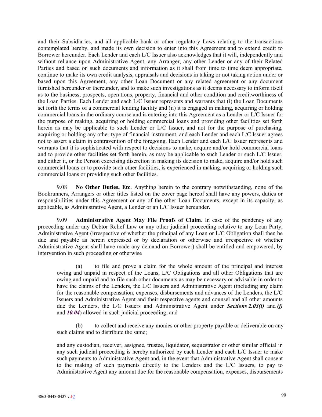 4863-0448-0437 v.17 90 and their Subsidiaries, and all applicable bank or other regulatory Laws relating to the transactions contemplated hereby, and made its own decision to enter into this Agreement and to extend credit to Borrower hereunder. Each Lender and each L/C Issuer also acknowledges that it will, independently and without reliance upon Administrative Agent, any Arranger, any other Lender or any of their Related Parties and based on such documents and information as it shall from time to time deem appropriate, continue to make its own credit analysis, appraisals and decisions in taking or not taking action under or based upon this Agreement, any other Loan Document or any related agreement or any document furnished hereunder or thereunder, and to make such investigations as it deems necessary to inform itself as to the business, prospects, operations, property, financial and other condition and creditworthiness of the Loan Parties. Each Lender and each L/C Issuer represents and warrants that (i) the Loan Documents set forth the terms of a commercial lending facility and (ii) it is engaged in making, acquiring or holding commercial loans in the ordinary course and is entering into this Agreement as a Lender or L/C Issuer for the purpose of making, acquiring or holding commercial loans and providing other facilities set forth herein as may be applicable to such Lender or L/C Issuer, and not for the purpose of purchasing, acquiring or holding any other type of financial instrument, and each Lender and each L/C Issuer agrees not to assert a claim in contravention of the foregoing. Each Lender and each L/C Issuer represents and warrants that it is sophisticated with respect to decisions to make, acquire and/or hold commercial loans and to provide other facilities set forth herein, as may be applicable to such Lender or such L/C Issuer, and either it, or the Person exercising discretion in making its decision to make, acquire and/or hold such commercial loans or to provide such other facilities, is experienced in making, acquiring or holding such commercial loans or providing such other facilities. 9.08 No Other Duties, Etc. Anything herein to the contrary notwithstanding, none of the Bookrunners, Arrangers or other titles listed on the cover page hereof shall have any powers, duties or responsibilities under this Agreement or any of the other Loan Documents, except in its capacity, as applicable, as Administrative Agent, a Lender or an L/C Issuer hereunder. 9.09 Administrative Agent May File Proofs of Claim. In case of the pendency of any proceeding under any Debtor Relief Law or any other judicial proceeding relative to any Loan Party, Administrative Agent (irrespective of whether the principal of any Loan or L/C Obligation shall then be due and payable as herein expressed or by declaration or otherwise and irrespective of whether Administrative Agent shall have made any demand on Borrower) shall be entitled and empowered, by intervention in such proceeding or otherwise (a) to file and prove a claim for the whole amount of the principal and interest owing and unpaid in respect of the Loans, L/C Obligations and all other Obligations that are owing and unpaid and to file such other documents as may be necessary or advisable in order to have the claims of the Lenders, the L/C Issuers and Administrative Agent (including any claim for the reasonable compensation, expenses, disbursements and advances of the Lenders, the L/C Issuers and Administrative Agent and their respective agents and counsel and all other amounts due the Lenders, the L/C Issuers and Administrative Agent under Sections 2.03(i) and (j) and 10.04) allowed in such judicial proceeding; and (b) to collect and receive any monies or other property payable or deliverable on any such claims and to distribute the same; and any custodian, receiver, assignee, trustee, liquidator, sequestrator or other similar official in any such judicial proceeding is hereby authorized by each Lender and each L/C Issuer to make such payments to Administrative Agent and, in the event that Administrative Agent shall consent to the making of such payments directly to the Lenders and the L/C Issuers, to pay to Administrative Agent any amount due for the reasonable compensation, expenses, disbursements