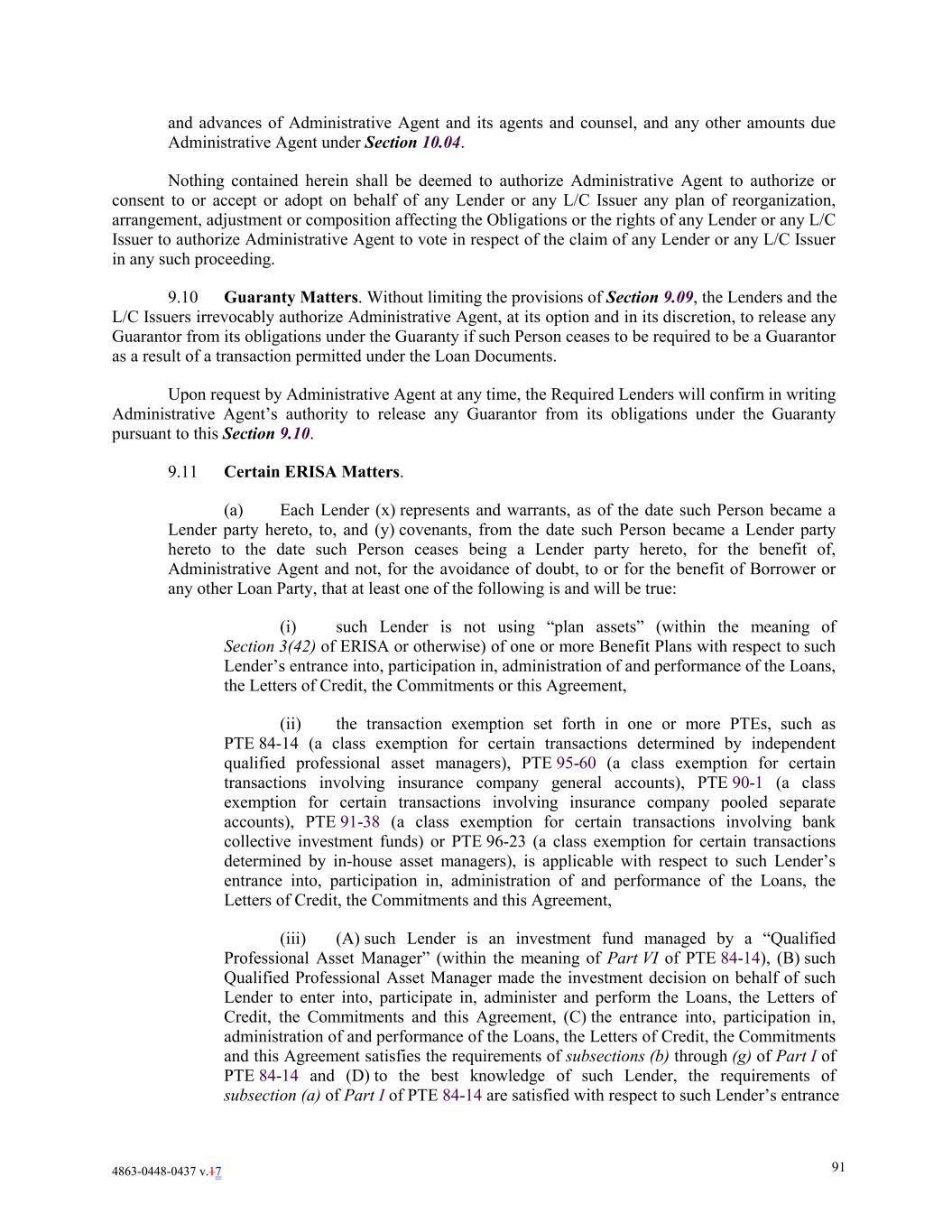 4863-0448-0437 v.17 91 and advances of Administrative Agent and its agents and counsel, and any other amounts due Administrative Agent under Section 10.04. Nothing contained herein shall be deemed to authorize Administrative Agent to authorize or consent to or accept or adopt on behalf of any Lender or any L/C Issuer any plan of reorganization, arrangement, adjustment or composition affecting the Obligations or the rights of any Lender or any L/C Issuer to authorize Administrative Agent to vote in respect of the claim of any Lender or any L/C Issuer in any such proceeding. 9.10 Guaranty Matters. Without limiting the provisions of Section 9.09, the Lenders and the L/C Issuers irrevocably authorize Administrative Agent, at its option and in its discretion, to release any Guarantor from its obligations under the Guaranty if such Person ceases to be required to be a Guarantor as a result of a transaction permitted under the Loan Documents. Upon request by Administrative Agent at any time, the Required Lenders will confirm in writing Administrative Agent’s authority to release any Guarantor from its obligations under the Guaranty pursuant to this Section 9.10. 9.11 Certain ERISA Matters. (a) Each Lender (x) represents and warrants, as of the date such Person became a Lender party hereto, to, and (y) covenants, from the date such Person became a Lender party hereto to the date such Person ceases being a Lender party hereto, for the benefit of, Administrative Agent and not, for the avoidance of doubt, to or for the benefit of Borrower or any other Loan Party, that at least one of the following is and will be true: (i) such Lender is not using “plan assets” (within the meaning of Section 3(42) of ERISA or otherwise) of one or more Benefit Plans with respect to such Lender’s entrance into, participation in, administration of and performance of the Loans, the Letters of Credit, the Commitments or this Agreement, (ii) the transaction exemption set forth in one or more PTEs, such as PTE 84-14 (a class exemption for certain transactions determined by independent qualified professional asset managers), PTE 95-60 (a class exemption for certain transactions involving insurance company general accounts), PTE 90-1 (a class exemption for certain transactions involving insurance company pooled separate accounts), PTE 91-38 (a class exemption for certain transactions involving bank collective investment funds) or PTE 96-23 (a class exemption for certain transactions determined by in-house asset managers), is applicable with respect to such Lender’s entrance into, participation in, administration of and performance of the Loans, the Letters of Credit, the Commitments and this Agreement, (iii) (A) such Lender is an investment fund managed by a “Qualified Professional Asset Manager” (within the meaning of Part VI of PTE 84-14), (B) such Qualified Professional Asset Manager made the investment decision on behalf of such Lender to enter into, participate in, administer and perform the Loans, the Letters of Credit, the Commitments and this Agreement, (C) the entrance into, participation in, administration of and performance of the Loans, the Letters of Credit, the Commitments and this Agreement satisfies the requirements of subsections (b) through (g) of Part I of PTE 84-14 and (D) to the best knowledge of such Lender, the requirements of subsection (a) of Part I of PTE 84-14 are satisfied with respect to such Lender’s entrance