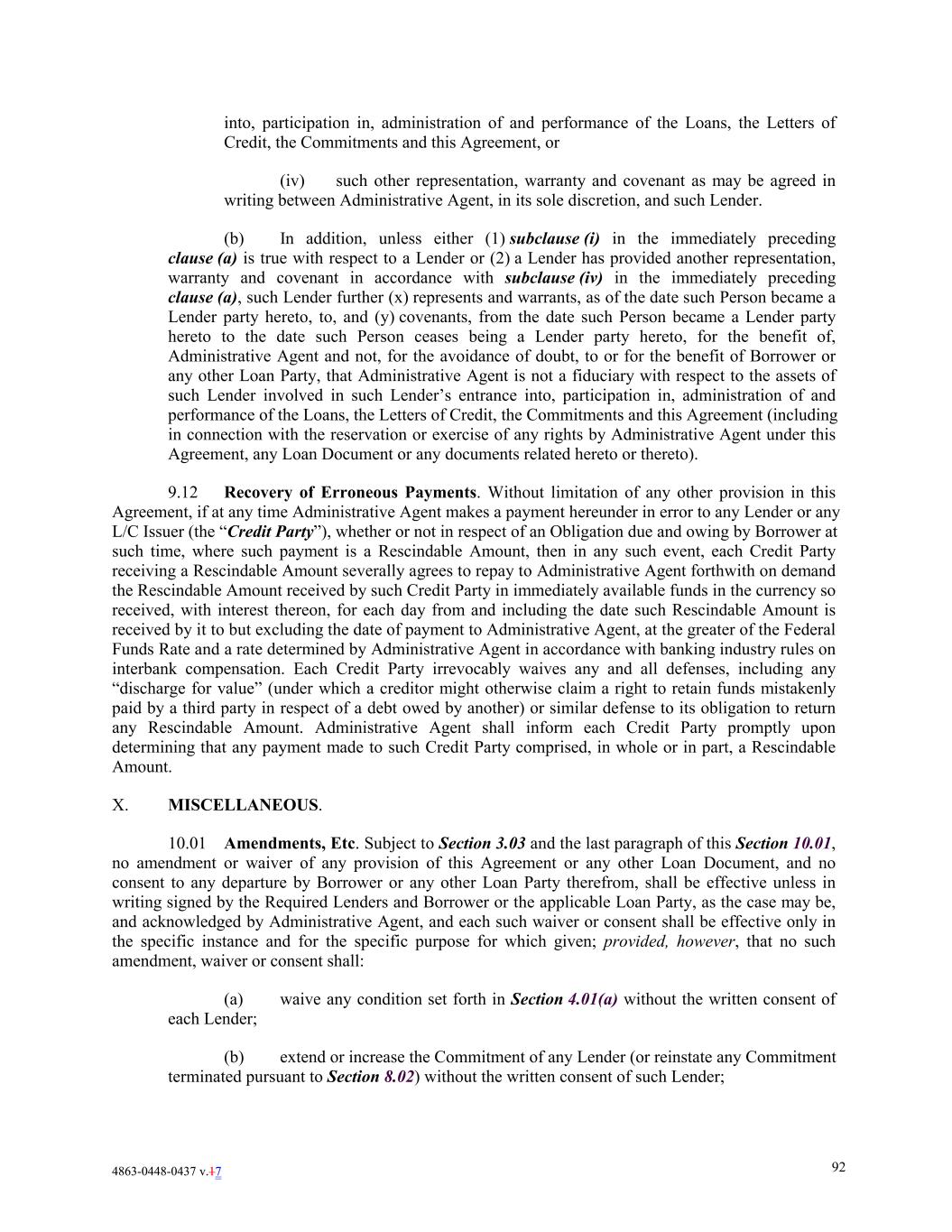 4863-0448-0437 v.17 92 into, participation in, administration of and performance of the Loans, the Letters of Credit, the Commitments and this Agreement, or (iv) such other representation, warranty and covenant as may be agreed in writing between Administrative Agent, in its sole discretion, and such Lender. (b) In addition, unless either (1) subclause (i) in the immediately preceding clause (a) is true with respect to a Lender or (2) a Lender has provided another representation, warranty and covenant in accordance with subclause (iv) in the immediately preceding clause (a), such Lender further (x) represents and warrants, as of the date such Person became a Lender party hereto, to, and (y) covenants, from the date such Person became a Lender party hereto to the date such Person ceases being a Lender party hereto, for the benefit of, Administrative Agent and not, for the avoidance of doubt, to or for the benefit of Borrower or any other Loan Party, that Administrative Agent is not a fiduciary with respect to the assets of such Lender involved in such Lender’s entrance into, participation in, administration of and performance of the Loans, the Letters of Credit, the Commitments and this Agreement (including in connection with the reservation or exercise of any rights by Administrative Agent under this Agreement, any Loan Document or any documents related hereto or thereto). 9.12 Recovery of Erroneous Payments. Without limitation of any other provision in this Agreement, if at any time Administrative Agent makes a payment hereunder in error to any Lender or any L/C Issuer (the “Credit Party”), whether or not in respect of an Obligation due and owing by Borrower at such time, where such payment is a Rescindable Amount, then in any such event, each Credit Party receiving a Rescindable Amount severally agrees to repay to Administrative Agent forthwith on demand the Rescindable Amount received by such Credit Party in immediately available funds in the currency so received, with interest thereon, for each day from and including the date such Rescindable Amount is received by it to but excluding the date of payment to Administrative Agent, at the greater of the Federal Funds Rate and a rate determined by Administrative Agent in accordance with banking industry rules on interbank compensation. Each Credit Party irrevocably waives any and all defenses, including any “discharge for value” (under which a creditor might otherwise claim a right to retain funds mistakenly paid by a third party in respect of a debt owed by another) or similar defense to its obligation to return any Rescindable Amount. Administrative Agent shall inform each Credit Party promptly upon determining that any payment made to such Credit Party comprised, in whole or in part, a Rescindable Amount. X. MISCELLANEOUS. 10.01 Amendments, Etc. Subject to Section 3.03 and the last paragraph of this Section 10.01, no amendment or waiver of any provision of this Agreement or any other Loan Document, and no consent to any departure by Borrower or any other Loan Party therefrom, shall be effective unless in writing signed by the Required Lenders and Borrower or the applicable Loan Party, as the case may be, and acknowledged by Administrative Agent, and each such waiver or consent shall be effective only in the specific instance and for the specific purpose for which given; provided, however, that no such amendment, waiver or consent shall: (a) waive any condition set forth in Section 4.01(a) without the written consent of each Lender; (b) extend or increase the Commitment of any Lender (or reinstate any Commitment terminated pursuant to Section 8.02) without the written consent of such Lender;