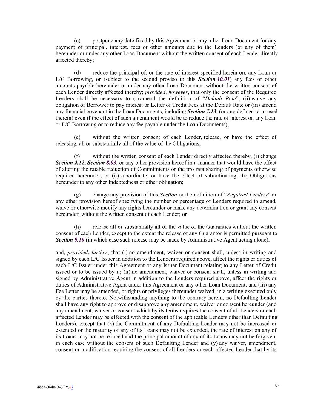 4863-0448-0437 v.17 93 (c) postpone any date fixed by this Agreement or any other Loan Document for any payment of principal, interest, fees or other amounts due to the Lenders (or any of them) hereunder or under any other Loan Document without the written consent of each Lender directly affected thereby; (d) reduce the principal of, or the rate of interest specified herein on, any Loan or L/C Borrowing, or (subject to the second proviso to this Section 10.01) any fees or other amounts payable hereunder or under any other Loan Document without the written consent of each Lender directly affected thereby; provided, however, that only the consent of the Required Lenders shall be necessary to (i) amend the definition of “Default Rate”, (ii) waive any obligation of Borrower to pay interest or Letter of Credit Fees at the Default Rate or (iii) amend any financial covenant in the Loan Documents, including Section 7.13, (or any defined term used therein) even if the effect of such amendment would be to reduce the rate of interest on any Loan or L/C Borrowing or to reduce any fee payable under the Loan Documents); (e) without the written consent of each Lender, release, or have the effect of releasing, all or substantially all of the value of the Obligations; (f) without the written consent of each Lender directly affected thereby, (i) change Section 2.12, Section 8.03, or any other provision hereof in a manner that would have the effect of altering the ratable reduction of Commitments or the pro rata sharing of payments otherwise required hereunder; or (ii) subordinate, or have the effect of subordinating, the Obligations hereunder to any other Indebtedness or other obligation; (g) change any provision of this Section or the definition of “Required Lenders” or any other provision hereof specifying the number or percentage of Lenders required to amend, waive or otherwise modify any rights hereunder or make any determination or grant any consent hereunder, without the written consent of each Lender; or (h) release all or substantially all of the value of the Guaranties without the written consent of each Lender, except to the extent the release of any Guarantor is permitted pursuant to Section 9.10 (in which case such release may be made by Administrative Agent acting alone); and, provided, further, that (i) no amendment, waiver or consent shall, unless in writing and signed by each L/C Issuer in addition to the Lenders required above, affect the rights or duties of each L/C Issuer under this Agreement or any Issuer Document relating to any Letter of Credit issued or to be issued by it; (ii) no amendment, waiver or consent shall, unless in writing and signed by Administrative Agent in addition to the Lenders required above, affect the rights or duties of Administrative Agent under this Agreement or any other Loan Document; and (iii) any Fee Letter may be amended, or rights or privileges thereunder waived, in a writing executed only by the parties thereto. Notwithstanding anything to the contrary herein, no Defaulting Lender shall have any right to approve or disapprove any amendment, waiver or consent hereunder (and any amendment, waiver or consent which by its terms requires the consent of all Lenders or each affected Lender may be effected with the consent of the applicable Lenders other than Defaulting Lenders), except that (x) the Commitment of any Defaulting Lender may not be increased or extended or the maturity of any of its Loans may not be extended, the rate of interest on any of its Loans may not be reduced and the principal amount of any of its Loans may not be forgiven, in each case without the consent of such Defaulting Lender and (y) any waiver, amendment, consent or modification requiring the consent of all Lenders or each affected Lender that by its