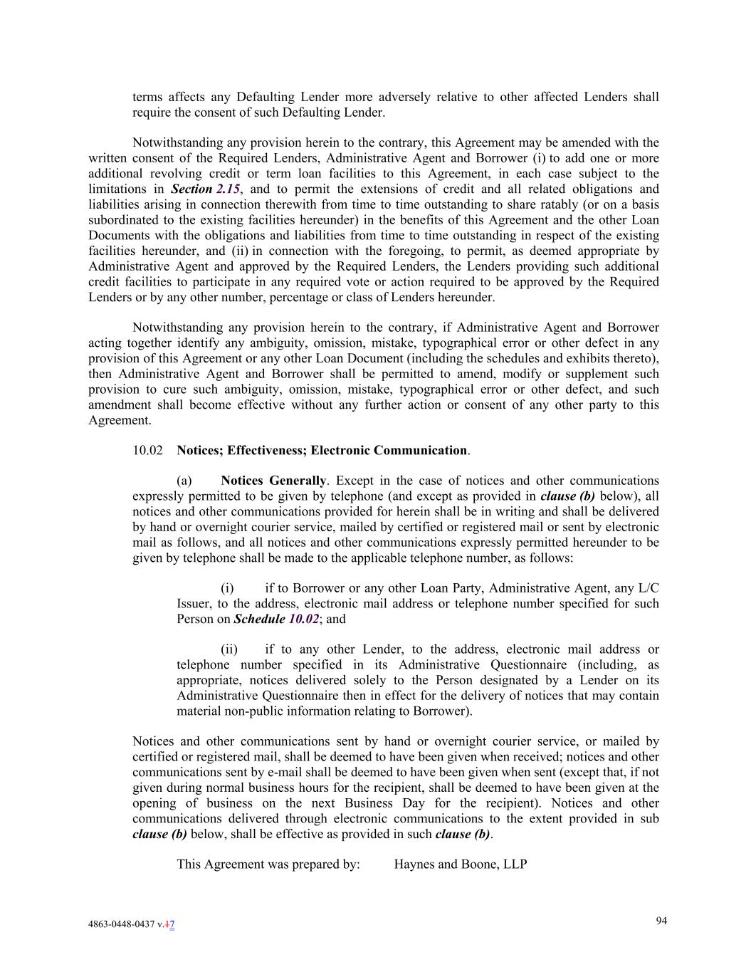 4863-0448-0437 v.17 94 terms affects any Defaulting Lender more adversely relative to other affected Lenders shall require the consent of such Defaulting Lender. Notwithstanding any provision herein to the contrary, this Agreement may be amended with the written consent of the Required Lenders, Administrative Agent and Borrower (i) to add one or more additional revolving credit or term loan facilities to this Agreement, in each case subject to the limitations in Section 2.15, and to permit the extensions of credit and all related obligations and liabilities arising in connection therewith from time to time outstanding to share ratably (or on a basis subordinated to the existing facilities hereunder) in the benefits of this Agreement and the other Loan Documents with the obligations and liabilities from time to time outstanding in respect of the existing facilities hereunder, and (ii) in connection with the foregoing, to permit, as deemed appropriate by Administrative Agent and approved by the Required Lenders, the Lenders providing such additional credit facilities to participate in any required vote or action required to be approved by the Required Lenders or by any other number, percentage or class of Lenders hereunder. Notwithstanding any provision herein to the contrary, if Administrative Agent and Borrower acting together identify any ambiguity, omission, mistake, typographical error or other defect in any provision of this Agreement or any other Loan Document (including the schedules and exhibits thereto), then Administrative Agent and Borrower shall be permitted to amend, modify or supplement such provision to cure such ambiguity, omission, mistake, typographical error or other defect, and such amendment shall become effective without any further action or consent of any other party to this Agreement. 10.02 Notices; Effectiveness; Electronic Communication. (a) Notices Generally. Except in the case of notices and other communications expressly permitted to be given by telephone (and except as provided in clause (b) below), all notices and other communications provided for herein shall be in writing and shall be delivered by hand or overnight courier service, mailed by certified or registered mail or sent by electronic mail as follows, and all notices and other communications expressly permitted hereunder to be given by telephone shall be made to the applicable telephone number, as follows: (i) if to Borrower or any other Loan Party, Administrative Agent, any L/C Issuer, to the address, electronic mail address or telephone number specified for such Person on Schedule 10.02; and (ii) if to any other Lender, to the address, electronic mail address or telephone number specified in its Administrative Questionnaire (including, as appropriate, notices delivered solely to the Person designated by a Lender on its Administrative Questionnaire then in effect for the delivery of notices that may contain material non-public information relating to Borrower). Notices and other communications sent by hand or overnight courier service, or mailed by certified or registered mail, shall be deemed to have been given when received; notices and other communications sent by e-mail shall be deemed to have been given when sent (except that, if not given during normal business hours for the recipient, shall be deemed to have been given at the opening of business on the next Business Day for the recipient). Notices and other communications delivered through electronic communications to the extent provided in sub clause (b) below, shall be effective as provided in such clause (b). This Agreement was prepared by: Haynes and Boone, LLP