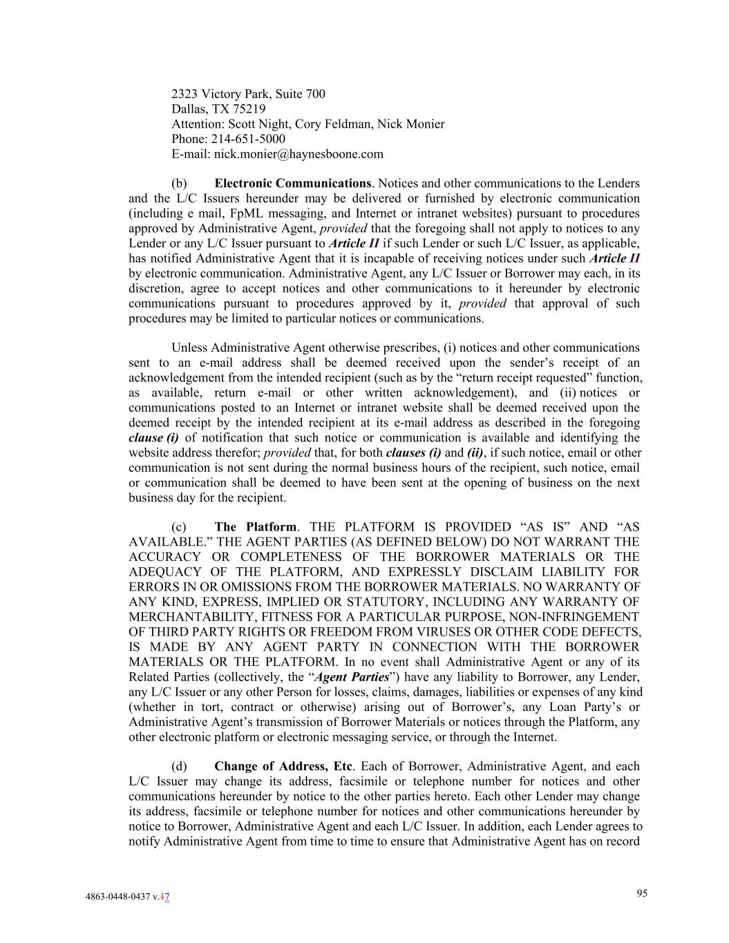 4863-0448-0437 v.17 95 2323 Victory Park, Suite 700 Dallas, TX 75219 Attention: Scott Night, Cory Feldman, Nick Monier Phone: 214-651-5000 E-mail: nick.monier@haynesboone.com (b) Electronic Communications. Notices and other communications to the Lenders and the L/C Issuers hereunder may be delivered or furnished by electronic communication (including e mail, FpML messaging, and Internet or intranet websites) pursuant to procedures approved by Administrative Agent, provided that the foregoing shall not apply to notices to any Lender or any L/C Issuer pursuant to Article II if such Lender or such L/C Issuer, as applicable, has notified Administrative Agent that it is incapable of receiving notices under such Article II by electronic communication. Administrative Agent, any L/C Issuer or Borrower may each, in its discretion, agree to accept notices and other communications to it hereunder by electronic communications pursuant to procedures approved by it, provided that approval of such procedures may be limited to particular notices or communications. Unless Administrative Agent otherwise prescribes, (i) notices and other communications sent to an e-mail address shall be deemed received upon the sender’s receipt of an acknowledgement from the intended recipient (such as by the “return receipt requested” function, as available, return e-mail or other written acknowledgement), and (ii) notices or communications posted to an Internet or intranet website shall be deemed received upon the deemed receipt by the intended recipient at its e-mail address as described in the foregoing clause (i) of notification that such notice or communication is available and identifying the website address therefor; provided that, for both clauses (i) and (ii), if such notice, email or other communication is not sent during the normal business hours of the recipient, such notice, email or communication shall be deemed to have been sent at the opening of business on the next business day for the recipient. (c) The Platform. THE PLATFORM IS PROVIDED “AS IS” AND “AS AVAILABLE.” THE AGENT PARTIES (AS DEFINED BELOW) DO NOT WARRANT THE ACCURACY OR COMPLETENESS OF THE BORROWER MATERIALS OR THE ADEQUACY OF THE PLATFORM, AND EXPRESSLY DISCLAIM LIABILITY FOR ERRORS IN OR OMISSIONS FROM THE BORROWER MATERIALS. NO WARRANTY OF ANY KIND, EXPRESS, IMPLIED OR STATUTORY, INCLUDING ANY WARRANTY OF MERCHANTABILITY, FITNESS FOR A PARTICULAR PURPOSE, NON-INFRINGEMENT OF THIRD PARTY RIGHTS OR FREEDOM FROM VIRUSES OR OTHER CODE DEFECTS, IS MADE BY ANY AGENT PARTY IN CONNECTION WITH THE BORROWER MATERIALS OR THE PLATFORM. In no event shall Administrative Agent or any of its Related Parties (collectively, the “Agent Parties”) have any liability to Borrower, any Lender, any L/C Issuer or any other Person for losses, claims, damages, liabilities or expenses of any kind (whether in tort, contract or otherwise) arising out of Borrower’s, any Loan Party’s or Administrative Agent’s transmission of Borrower Materials or notices through the Platform, any other electronic platform or electronic messaging service, or through the Internet. (d) Change of Address, Etc. Each of Borrower, Administrative Agent, and each L/C Issuer may change its address, facsimile or telephone number for notices and other communications hereunder by notice to the other parties hereto. Each other Lender may change its address, facsimile or telephone number for notices and other communications hereunder by notice to Borrower, Administrative Agent and each L/C Issuer. In addition, each Lender agrees to notify Administrative Agent from time to time to ensure that Administrative Agent has on record