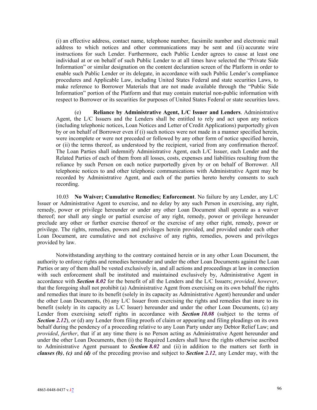 4863-0448-0437 v.17 96 (i) an effective address, contact name, telephone number, facsimile number and electronic mail address to which notices and other communications may be sent and (ii) accurate wire instructions for such Lender. Furthermore, each Public Lender agrees to cause at least one individual at or on behalf of such Public Lender to at all times have selected the “Private Side Information” or similar designation on the content declaration screen of the Platform in order to enable such Public Lender or its delegate, in accordance with such Public Lender’s compliance procedures and Applicable Law, including United States Federal and state securities Laws, to make reference to Borrower Materials that are not made available through the “Public Side Information” portion of the Platform and that may contain material non-public information with respect to Borrower or its securities for purposes of United States Federal or state securities laws. (e) Reliance by Administrative Agent, L/C Issuer and Lenders. Administrative Agent, the L/C Issuers and the Lenders shall be entitled to rely and act upon any notices (including telephonic notices, Loan Notices and Letter of Credit Applications) purportedly given by or on behalf of Borrower even if (i) such notices were not made in a manner specified herein, were incomplete or were not preceded or followed by any other form of notice specified herein, or (ii) the terms thereof, as understood by the recipient, varied from any confirmation thereof. The Loan Parties shall indemnify Administrative Agent, each L/C Issuer, each Lender and the Related Parties of each of them from all losses, costs, expenses and liabilities resulting from the reliance by such Person on each notice purportedly given by or on behalf of Borrower. All telephonic notices to and other telephonic communications with Administrative Agent may be recorded by Administrative Agent, and each of the parties hereto hereby consents to such recording. 10.03 No Waiver; Cumulative Remedies; Enforcement. No failure by any Lender, any L/C Issuer or Administrative Agent to exercise, and no delay by any such Person in exercising, any right, remedy, power or privilege hereunder or under any other Loan Document shall operate as a waiver thereof; nor shall any single or partial exercise of any right, remedy, power or privilege hereunder preclude any other or further exercise thereof or the exercise of any other right, remedy, power or privilege. The rights, remedies, powers and privileges herein provided, and provided under each other Loan Document, are cumulative and not exclusive of any rights, remedies, powers and privileges provided by law. Notwithstanding anything to the contrary contained herein or in any other Loan Document, the authority to enforce rights and remedies hereunder and under the other Loan Documents against the Loan Parties or any of them shall be vested exclusively in, and all actions and proceedings at law in connection with such enforcement shall be instituted and maintained exclusively by, Administrative Agent in accordance with Section 8.02 for the benefit of all the Lenders and the L/C Issuers; provided, however, that the foregoing shall not prohibit (a) Administrative Agent from exercising on its own behalf the rights and remedies that inure to its benefit (solely in its capacity as Administrative Agent) hereunder and under the other Loan Documents, (b) any L/C Issuer from exercising the rights and remedies that inure to its benefit (solely in its capacity as L/C Issuer) hereunder and under the other Loan Documents, (c) any Lender from exercising setoff rights in accordance with Section 10.08 (subject to the terms of Section 2.12), or (d) any Lender from filing proofs of claim or appearing and filing pleadings on its own behalf during the pendency of a proceeding relative to any Loan Party under any Debtor Relief Law; and provided, further, that if at any time there is no Person acting as Administrative Agent hereunder and under the other Loan Documents, then (i) the Required Lenders shall have the rights otherwise ascribed to Administrative Agent pursuant to Section 8.02 and (ii) in addition to the matters set forth in clauses (b), (c) and (d) of the preceding proviso and subject to Section 2.12, any Lender may, with the