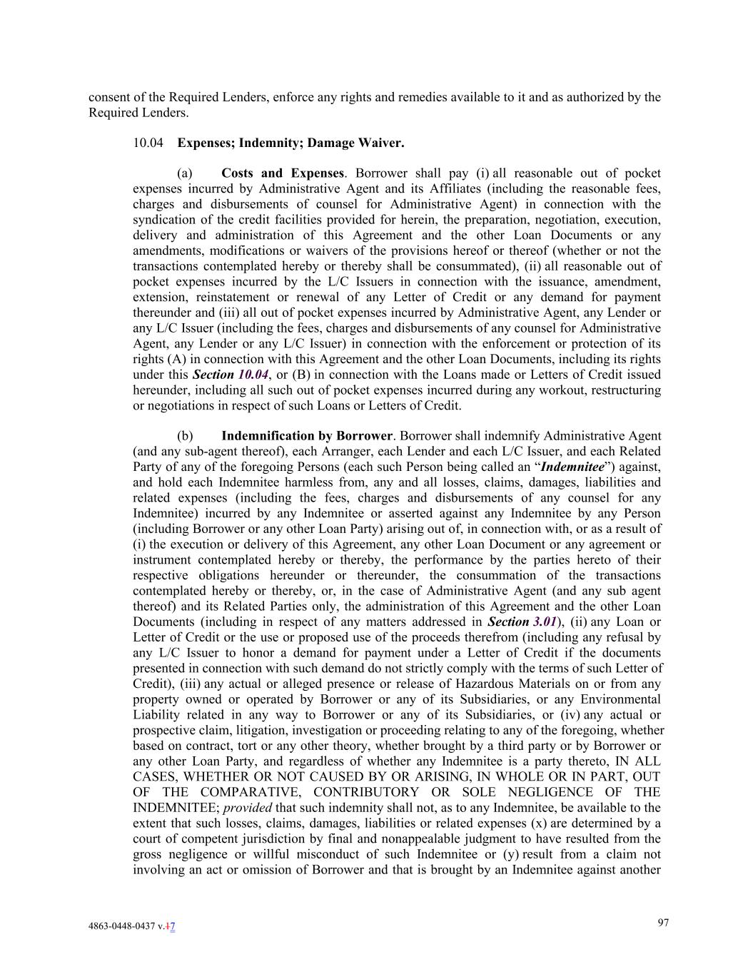 4863-0448-0437 v.17 97 consent of the Required Lenders, enforce any rights and remedies available to it and as authorized by the Required Lenders. 10.04 Expenses; Indemnity; Damage Waiver. (a) Costs and Expenses. Borrower shall pay (i) all reasonable out of pocket expenses incurred by Administrative Agent and its Affiliates (including the reasonable fees, charges and disbursements of counsel for Administrative Agent) in connection with the syndication of the credit facilities provided for herein, the preparation, negotiation, execution, delivery and administration of this Agreement and the other Loan Documents or any amendments, modifications or waivers of the provisions hereof or thereof (whether or not the transactions contemplated hereby or thereby shall be consummated), (ii) all reasonable out of pocket expenses incurred by the L/C Issuers in connection with the issuance, amendment, extension, reinstatement or renewal of any Letter of Credit or any demand for payment thereunder and (iii) all out of pocket expenses incurred by Administrative Agent, any Lender or any L/C Issuer (including the fees, charges and disbursements of any counsel for Administrative Agent, any Lender or any L/C Issuer) in connection with the enforcement or protection of its rights (A) in connection with this Agreement and the other Loan Documents, including its rights under this Section 10.04, or (B) in connection with the Loans made or Letters of Credit issued hereunder, including all such out of pocket expenses incurred during any workout, restructuring or negotiations in respect of such Loans or Letters of Credit. (b) Indemnification by Borrower. Borrower shall indemnify Administrative Agent (and any sub-agent thereof), each Arranger, each Lender and each L/C Issuer, and each Related Party of any of the foregoing Persons (each such Person being called an “Indemnitee”) against, and hold each Indemnitee harmless from, any and all losses, claims, damages, liabilities and related expenses (including the fees, charges and disbursements of any counsel for any Indemnitee) incurred by any Indemnitee or asserted against any Indemnitee by any Person (including Borrower or any other Loan Party) arising out of, in connection with, or as a result of (i) the execution or delivery of this Agreement, any other Loan Document or any agreement or instrument contemplated hereby or thereby, the performance by the parties hereto of their respective obligations hereunder or thereunder, the consummation of the transactions contemplated hereby or thereby, or, in the case of Administrative Agent (and any sub agent thereof) and its Related Parties only, the administration of this Agreement and the other Loan Documents (including in respect of any matters addressed in Section 3.01), (ii) any Loan or Letter of Credit or the use or proposed use of the proceeds therefrom (including any refusal by any L/C Issuer to honor a demand for payment under a Letter of Credit if the documents presented in connection with such demand do not strictly comply with the terms of such Letter of Credit), (iii) any actual or alleged presence or release of Hazardous Materials on or from any property owned or operated by Borrower or any of its Subsidiaries, or any Environmental Liability related in any way to Borrower or any of its Subsidiaries, or (iv) any actual or prospective claim, litigation, investigation or proceeding relating to any of the foregoing, whether based on contract, tort or any other theory, whether brought by a third party or by Borrower or any other Loan Party, and regardless of whether any Indemnitee is a party thereto, IN ALL CASES, WHETHER OR NOT CAUSED BY OR ARISING, IN WHOLE OR IN PART, OUT OF THE COMPARATIVE, CONTRIBUTORY OR SOLE NEGLIGENCE OF THE INDEMNITEE; provided that such indemnity shall not, as to any Indemnitee, be available to the extent that such losses, claims, damages, liabilities or related expenses (x) are determined by a court of competent jurisdiction by final and nonappealable judgment to have resulted from the gross negligence or willful misconduct of such Indemnitee or (y) result from a claim not involving an act or omission of Borrower and that is brought by an Indemnitee against another