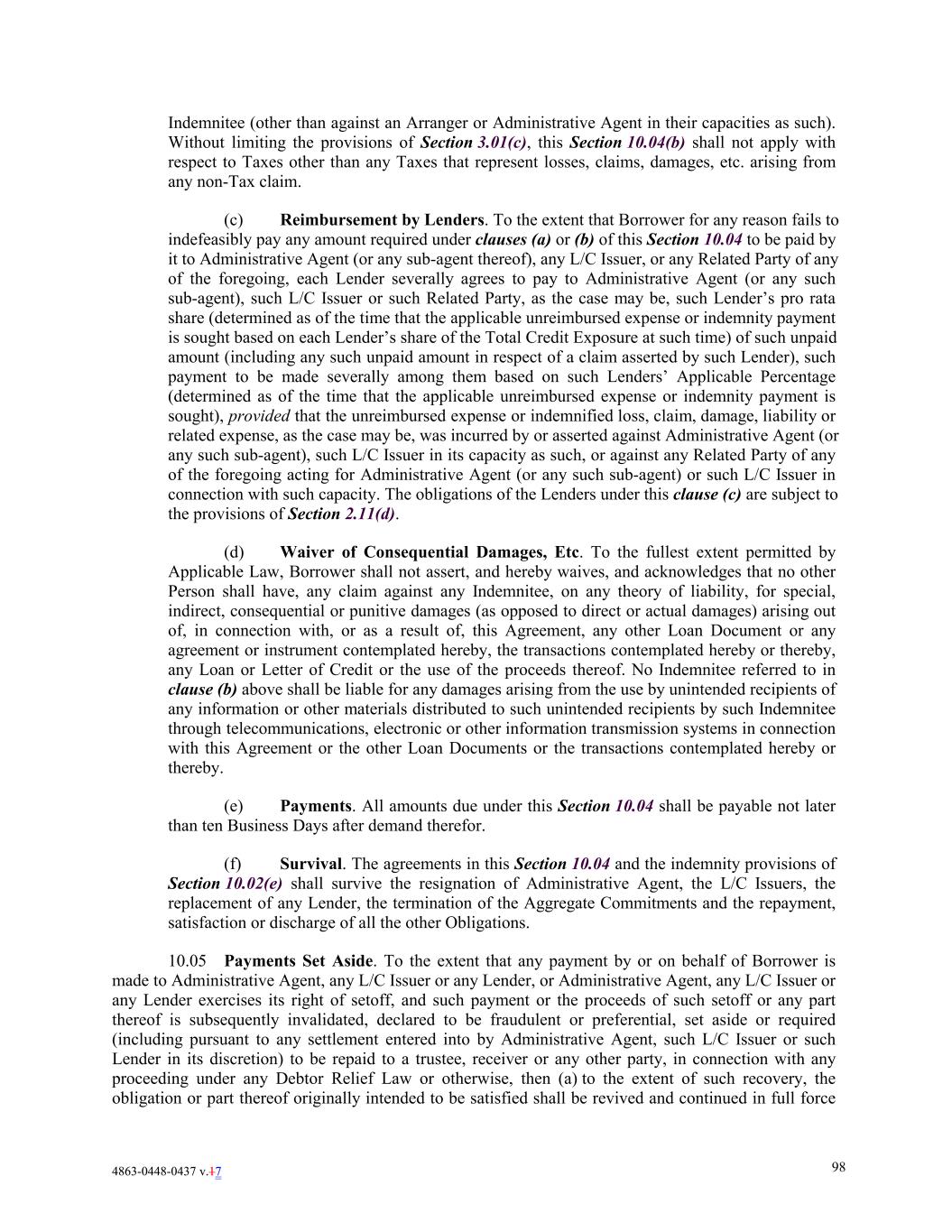 4863-0448-0437 v.17 98 Indemnitee (other than against an Arranger or Administrative Agent in their capacities as such). Without limiting the provisions of Section 3.01(c), this Section 10.04(b) shall not apply with respect to Taxes other than any Taxes that represent losses, claims, damages, etc. arising from any non-Tax claim. (c) Reimbursement by Lenders. To the extent that Borrower for any reason fails to indefeasibly pay any amount required under clauses (a) or (b) of this Section 10.04 to be paid by it to Administrative Agent (or any sub-agent thereof), any L/C Issuer, or any Related Party of any of the foregoing, each Lender severally agrees to pay to Administrative Agent (or any such sub-agent), such L/C Issuer or such Related Party, as the case may be, such Lender’s pro rata share (determined as of the time that the applicable unreimbursed expense or indemnity payment is sought based on each Lender’s share of the Total Credit Exposure at such time) of such unpaid amount (including any such unpaid amount in respect of a claim asserted by such Lender), such payment to be made severally among them based on such Lenders’ Applicable Percentage (determined as of the time that the applicable unreimbursed expense or indemnity payment is sought), provided that the unreimbursed expense or indemnified loss, claim, damage, liability or related expense, as the case may be, was incurred by or asserted against Administrative Agent (or any such sub-agent), such L/C Issuer in its capacity as such, or against any Related Party of any of the foregoing acting for Administrative Agent (or any such sub-agent) or such L/C Issuer in connection with such capacity. The obligations of the Lenders under this clause (c) are subject to the provisions of Section 2.11(d). (d) Waiver of Consequential Damages, Etc. To the fullest extent permitted by Applicable Law, Borrower shall not assert, and hereby waives, and acknowledges that no other Person shall have, any claim against any Indemnitee, on any theory of liability, for special, indirect, consequential or punitive damages (as opposed to direct or actual damages) arising out of, in connection with, or as a result of, this Agreement, any other Loan Document or any agreement or instrument contemplated hereby, the transactions contemplated hereby or thereby, any Loan or Letter of Credit or the use of the proceeds thereof. No Indemnitee referred to in clause (b) above shall be liable for any damages arising from the use by unintended recipients of any information or other materials distributed to such unintended recipients by such Indemnitee through telecommunications, electronic or other information transmission systems in connection with this Agreement or the other Loan Documents or the transactions contemplated hereby or thereby. (e) Payments. All amounts due under this Section 10.04 shall be payable not later than ten Business Days after demand therefor. (f) Survival. The agreements in this Section 10.04 and the indemnity provisions of Section 10.02(e) shall survive the resignation of Administrative Agent, the L/C Issuers, the replacement of any Lender, the termination of the Aggregate Commitments and the repayment, satisfaction or discharge of all the other Obligations. 10.05 Payments Set Aside. To the extent that any payment by or on behalf of Borrower is made to Administrative Agent, any L/C Issuer or any Lender, or Administrative Agent, any L/C Issuer or any Lender exercises its right of setoff, and such payment or the proceeds of such setoff or any part thereof is subsequently invalidated, declared to be fraudulent or preferential, set aside or required (including pursuant to any settlement entered into by Administrative Agent, such L/C Issuer or such Lender in its discretion) to be repaid to a trustee, receiver or any other party, in connection with any proceeding under any Debtor Relief Law or otherwise, then (a) to the extent of such recovery, the obligation or part thereof originally intended to be satisfied shall be revived and continued in full force