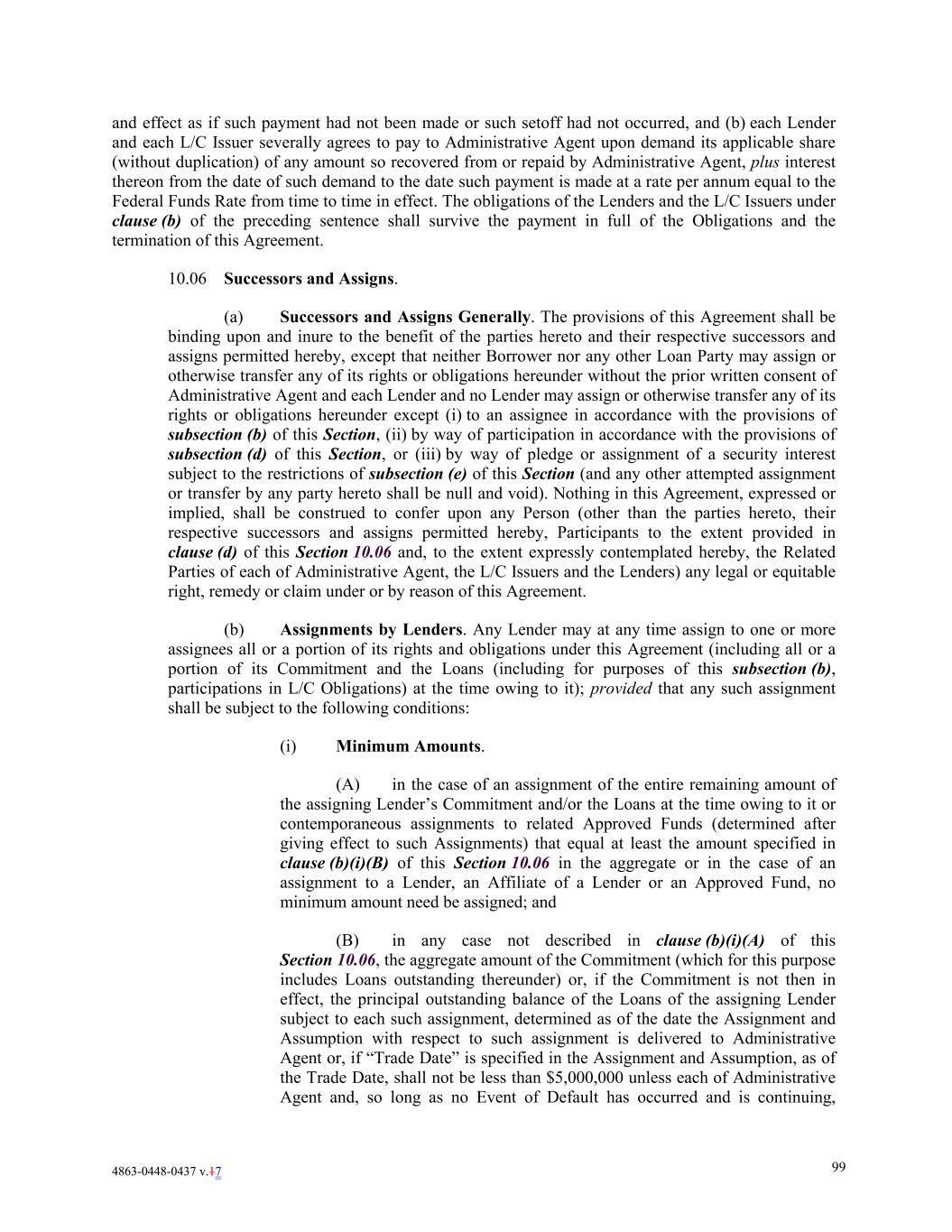 4863-0448-0437 v.17 99 and effect as if such payment had not been made or such setoff had not occurred, and (b) each Lender and each L/C Issuer severally agrees to pay to Administrative Agent upon demand its applicable share (without duplication) of any amount so recovered from or repaid by Administrative Agent, plus interest thereon from the date of such demand to the date such payment is made at a rate per annum equal to the Federal Funds Rate from time to time in effect. The obligations of the Lenders and the L/C Issuers under clause (b) of the preceding sentence shall survive the payment in full of the Obligations and the termination of this Agreement. 10.06 Successors and Assigns. (a) Successors and Assigns Generally. The provisions of this Agreement shall be binding upon and inure to the benefit of the parties hereto and their respective successors and assigns permitted hereby, except that neither Borrower nor any other Loan Party may assign or otherwise transfer any of its rights or obligations hereunder without the prior written consent of Administrative Agent and each Lender and no Lender may assign or otherwise transfer any of its rights or obligations hereunder except (i) to an assignee in accordance with the provisions of subsection (b) of this Section, (ii) by way of participation in accordance with the provisions of subsection (d) of this Section, or (iii) by way of pledge or assignment of a security interest subject to the restrictions of subsection (e) of this Section (and any other attempted assignment or transfer by any party hereto shall be null and void). Nothing in this Agreement, expressed or implied, shall be construed to confer upon any Person (other than the parties hereto, their respective successors and assigns permitted hereby, Participants to the extent provided in clause (d) of this Section 10.06 and, to the extent expressly contemplated hereby, the Related Parties of each of Administrative Agent, the L/C Issuers and the Lenders) any legal or equitable right, remedy or claim under or by reason of this Agreement. (b) Assignments by Lenders. Any Lender may at any time assign to one or more assignees all or a portion of its rights and obligations under this Agreement (including all or a portion of its Commitment and the Loans (including for purposes of this subsection (b), participations in L/C Obligations) at the time owing to it); provided that any such assignment shall be subject to the following conditions: (i) Minimum Amounts. (A) in the case of an assignment of the entire remaining amount of the assigning Lender’s Commitment and/or the Loans at the time owing to it or contemporaneous assignments to related Approved Funds (determined after giving effect to such Assignments) that equal at least the amount specified in clause (b)(i)(B) of this Section 10.06 in the aggregate or in the case of an assignment to a Lender, an Affiliate of a Lender or an Approved Fund, no minimum amount need be assigned; and (B) in any case not described in clause (b)(i)(A) of this Section 10.06, the aggregate amount of the Commitment (which for this purpose includes Loans outstanding thereunder) or, if the Commitment is not then in effect, the principal outstanding balance of the Loans of the assigning Lender subject to each such assignment, determined as of the date the Assignment and Assumption with respect to such assignment is delivered to Administrative Agent or, if “Trade Date” is specified in the Assignment and Assumption, as of the Trade Date, shall not be less than $5,000,000 unless each of Administrative Agent and, so long as no Event of Default has occurred and is continuing,