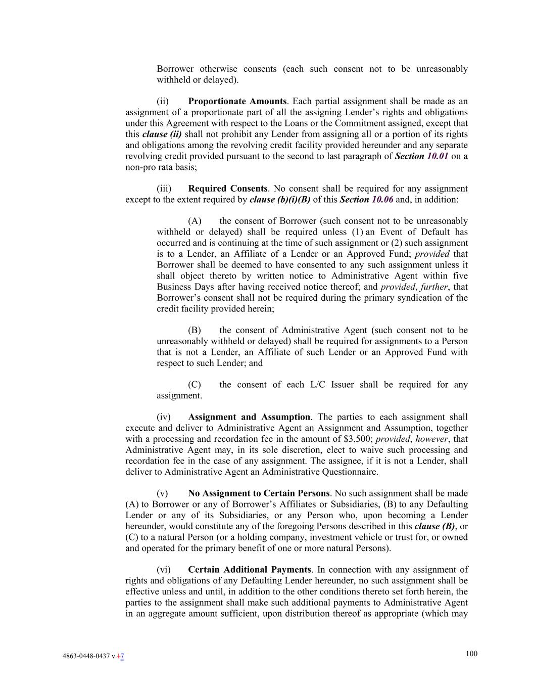 4863-0448-0437 v.17 100 Borrower otherwise consents (each such consent not to be unreasonably withheld or delayed). (ii) Proportionate Amounts. Each partial assignment shall be made as an assignment of a proportionate part of all the assigning Lender’s rights and obligations under this Agreement with respect to the Loans or the Commitment assigned, except that this clause (ii) shall not prohibit any Lender from assigning all or a portion of its rights and obligations among the revolving credit facility provided hereunder and any separate revolving credit provided pursuant to the second to last paragraph of Section 10.01 on a non-pro rata basis; (iii) Required Consents. No consent shall be required for any assignment except to the extent required by clause (b)(i)(B) of this Section 10.06 and, in addition: (A) the consent of Borrower (such consent not to be unreasonably withheld or delayed) shall be required unless (1) an Event of Default has occurred and is continuing at the time of such assignment or (2) such assignment is to a Lender, an Affiliate of a Lender or an Approved Fund; provided that Borrower shall be deemed to have consented to any such assignment unless it shall object thereto by written notice to Administrative Agent within five Business Days after having received notice thereof; and provided, further, that Borrower’s consent shall not be required during the primary syndication of the credit facility provided herein; (B) the consent of Administrative Agent (such consent not to be unreasonably withheld or delayed) shall be required for assignments to a Person that is not a Lender, an Affiliate of such Lender or an Approved Fund with respect to such Lender; and (C) the consent of each L/C Issuer shall be required for any assignment. (iv) Assignment and Assumption. The parties to each assignment shall execute and deliver to Administrative Agent an Assignment and Assumption, together with a processing and recordation fee in the amount of $3,500; provided, however, that Administrative Agent may, in its sole discretion, elect to waive such processing and recordation fee in the case of any assignment. The assignee, if it is not a Lender, shall deliver to Administrative Agent an Administrative Questionnaire. (v) No Assignment to Certain Persons. No such assignment shall be made (A) to Borrower or any of Borrower’s Affiliates or Subsidiaries, (B) to any Defaulting Lender or any of its Subsidiaries, or any Person who, upon becoming a Lender hereunder, would constitute any of the foregoing Persons described in this clause (B), or (C) to a natural Person (or a holding company, investment vehicle or trust for, or owned and operated for the primary benefit of one or more natural Persons). (vi) Certain Additional Payments. In connection with any assignment of rights and obligations of any Defaulting Lender hereunder, no such assignment shall be effective unless and until, in addition to the other conditions thereto set forth herein, the parties to the assignment shall make such additional payments to Administrative Agent in an aggregate amount sufficient, upon distribution thereof as appropriate (which may