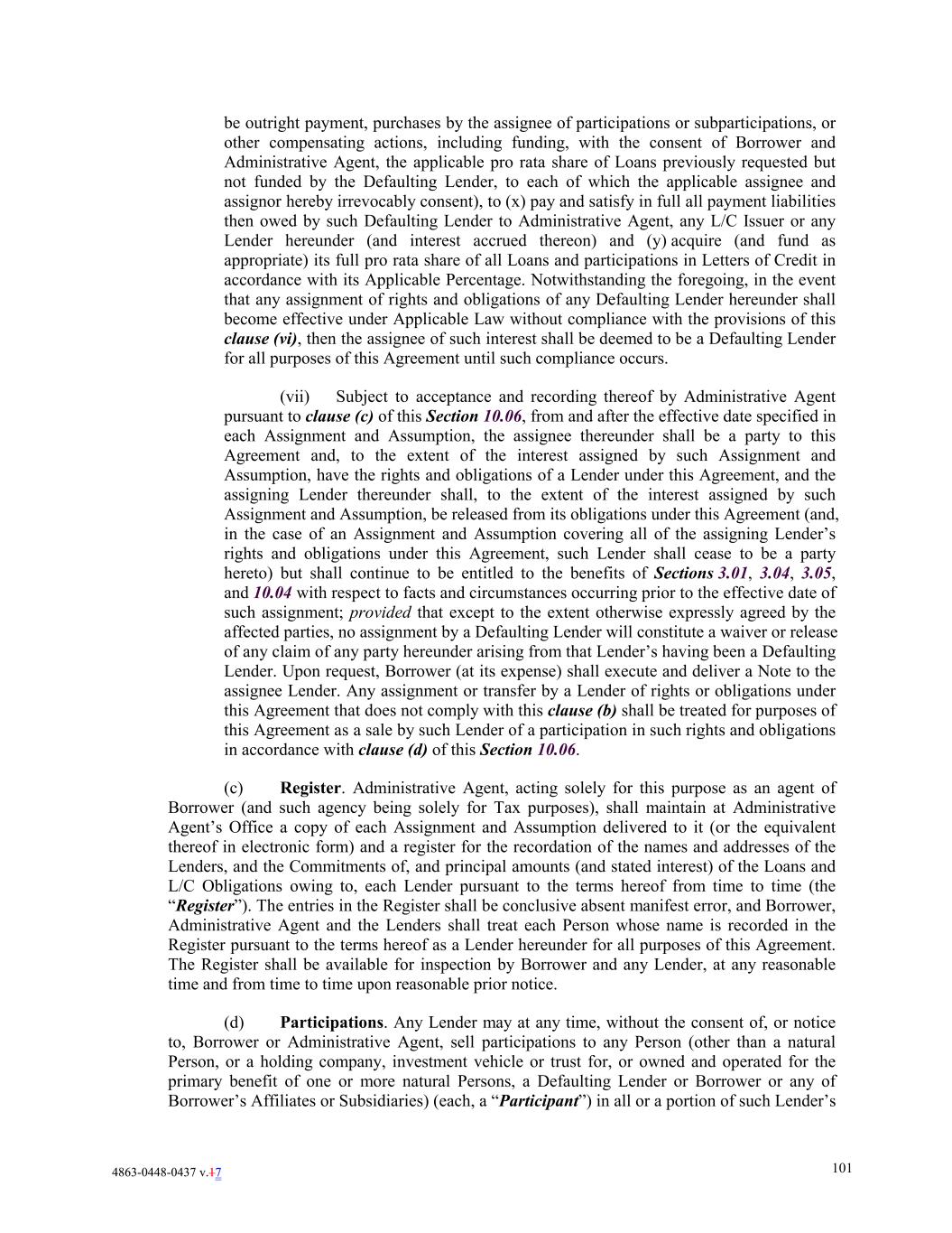 4863-0448-0437 v.17 101 be outright payment, purchases by the assignee of participations or subparticipations, or other compensating actions, including funding, with the consent of Borrower and Administrative Agent, the applicable pro rata share of Loans previously requested but not funded by the Defaulting Lender, to each of which the applicable assignee and assignor hereby irrevocably consent), to (x) pay and satisfy in full all payment liabilities then owed by such Defaulting Lender to Administrative Agent, any L/C Issuer or any Lender hereunder (and interest accrued thereon) and (y) acquire (and fund as appropriate) its full pro rata share of all Loans and participations in Letters of Credit in accordance with its Applicable Percentage. Notwithstanding the foregoing, in the event that any assignment of rights and obligations of any Defaulting Lender hereunder shall become effective under Applicable Law without compliance with the provisions of this clause (vi), then the assignee of such interest shall be deemed to be a Defaulting Lender for all purposes of this Agreement until such compliance occurs. (vii) Subject to acceptance and recording thereof by Administrative Agent pursuant to clause (c) of this Section 10.06, from and after the effective date specified in each Assignment and Assumption, the assignee thereunder shall be a party to this Agreement and, to the extent of the interest assigned by such Assignment and Assumption, have the rights and obligations of a Lender under this Agreement, and the assigning Lender thereunder shall, to the extent of the interest assigned by such Assignment and Assumption, be released from its obligations under this Agreement (and, in the case of an Assignment and Assumption covering all of the assigning Lender’s rights and obligations under this Agreement, such Lender shall cease to be a party hereto) but shall continue to be entitled to the benefits of Sections 3.01, 3.04, 3.05, and 10.04 with respect to facts and circumstances occurring prior to the effective date of such assignment; provided that except to the extent otherwise expressly agreed by the affected parties, no assignment by a Defaulting Lender will constitute a waiver or release of any claim of any party hereunder arising from that Lender’s having been a Defaulting Lender. Upon request, Borrower (at its expense) shall execute and deliver a Note to the assignee Lender. Any assignment or transfer by a Lender of rights or obligations under this Agreement that does not comply with this clause (b) shall be treated for purposes of this Agreement as a sale by such Lender of a participation in such rights and obligations in accordance with clause (d) of this Section 10.06. (c) Register. Administrative Agent, acting solely for this purpose as an agent of Borrower (and such agency being solely for Tax purposes), shall maintain at Administrative Agent’s Office a copy of each Assignment and Assumption delivered to it (or the equivalent thereof in electronic form) and a register for the recordation of the names and addresses of the Lenders, and the Commitments of, and principal amounts (and stated interest) of the Loans and L/C Obligations owing to, each Lender pursuant to the terms hereof from time to time (the “Register”). The entries in the Register shall be conclusive absent manifest error, and Borrower, Administrative Agent and the Lenders shall treat each Person whose name is recorded in the Register pursuant to the terms hereof as a Lender hereunder for all purposes of this Agreement. The Register shall be available for inspection by Borrower and any Lender, at any reasonable time and from time to time upon reasonable prior notice. (d) Participations. Any Lender may at any time, without the consent of, or notice to, Borrower or Administrative Agent, sell participations to any Person (other than a natural Person, or a holding company, investment vehicle or trust for, or owned and operated for the primary benefit of one or more natural Persons, a Defaulting Lender or Borrower or any of Borrower’s Affiliates or Subsidiaries) (each, a “Participant”) in all or a portion of such Lender’s