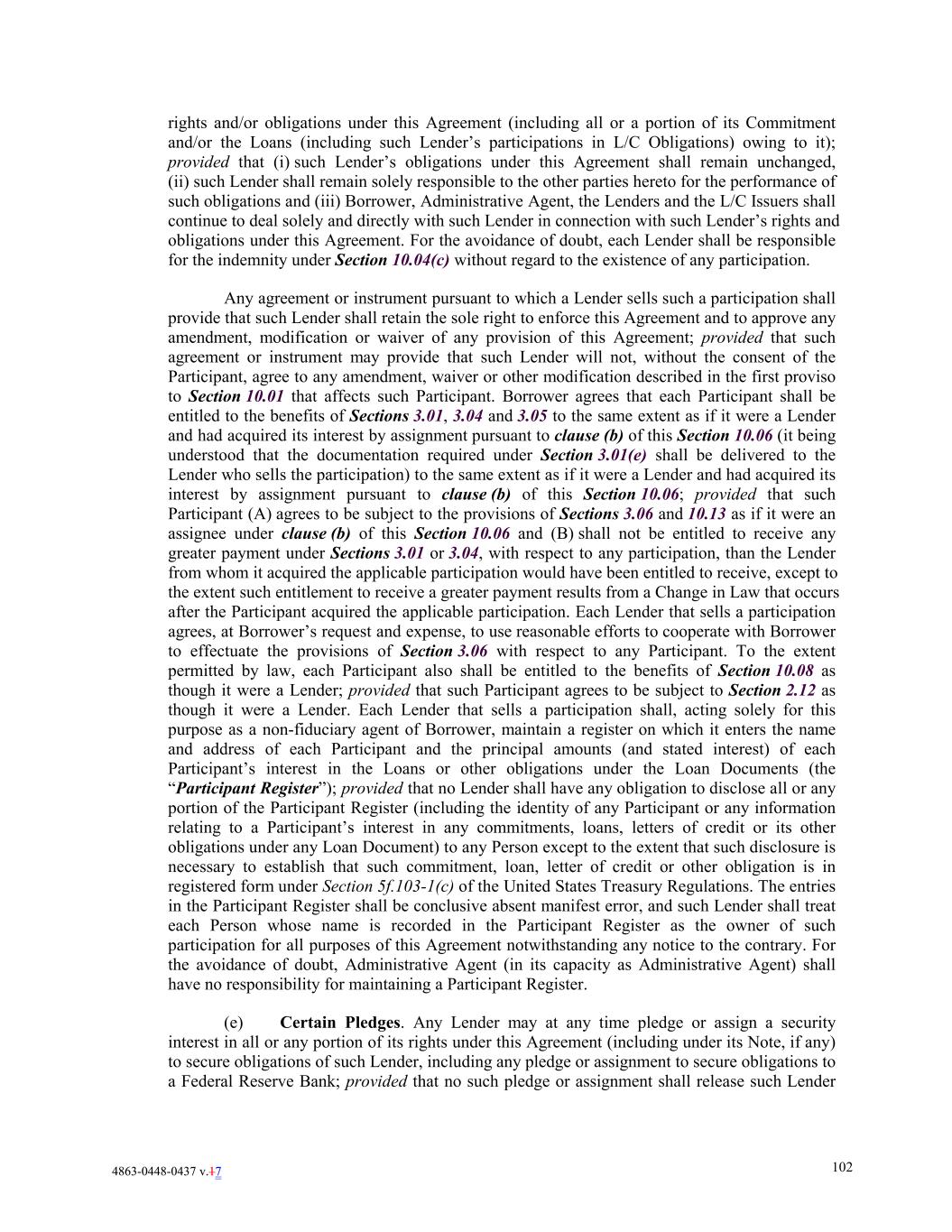 4863-0448-0437 v.17 102 rights and/or obligations under this Agreement (including all or a portion of its Commitment and/or the Loans (including such Lender’s participations in L/C Obligations) owing to it); provided that (i) such Lender’s obligations under this Agreement shall remain unchanged, (ii) such Lender shall remain solely responsible to the other parties hereto for the performance of such obligations and (iii) Borrower, Administrative Agent, the Lenders and the L/C Issuers shall continue to deal solely and directly with such Lender in connection with such Lender’s rights and obligations under this Agreement. For the avoidance of doubt, each Lender shall be responsible for the indemnity under Section 10.04(c) without regard to the existence of any participation. Any agreement or instrument pursuant to which a Lender sells such a participation shall provide that such Lender shall retain the sole right to enforce this Agreement and to approve any amendment, modification or waiver of any provision of this Agreement; provided that such agreement or instrument may provide that such Lender will not, without the consent of the Participant, agree to any amendment, waiver or other modification described in the first proviso to Section 10.01 that affects such Participant. Borrower agrees that each Participant shall be entitled to the benefits of Sections 3.01, 3.04 and 3.05 to the same extent as if it were a Lender and had acquired its interest by assignment pursuant to clause (b) of this Section 10.06 (it being understood that the documentation required under Section 3.01(e) shall be delivered to the Lender who sells the participation) to the same extent as if it were a Lender and had acquired its interest by assignment pursuant to clause (b) of this Section 10.06; provided that such Participant (A) agrees to be subject to the provisions of Sections 3.06 and 10.13 as if it were an assignee under clause (b) of this Section 10.06 and (B) shall not be entitled to receive any greater payment under Sections 3.01 or 3.04, with respect to any participation, than the Lender from whom it acquired the applicable participation would have been entitled to receive, except to the extent such entitlement to receive a greater payment results from a Change in Law that occurs after the Participant acquired the applicable participation. Each Lender that sells a participation agrees, at Borrower’s request and expense, to use reasonable efforts to cooperate with Borrower to effectuate the provisions of Section 3.06 with respect to any Participant. To the extent permitted by law, each Participant also shall be entitled to the benefits of Section 10.08 as though it were a Lender; provided that such Participant agrees to be subject to Section 2.12 as though it were a Lender. Each Lender that sells a participation shall, acting solely for this purpose as a non-fiduciary agent of Borrower, maintain a register on which it enters the name and address of each Participant and the principal amounts (and stated interest) of each Participant’s interest in the Loans or other obligations under the Loan Documents (the “Participant Register”); provided that no Lender shall have any obligation to disclose all or any portion of the Participant Register (including the identity of any Participant or any information relating to a Participant’s interest in any commitments, loans, letters of credit or its other obligations under any Loan Document) to any Person except to the extent that such disclosure is necessary to establish that such commitment, loan, letter of credit or other obligation is in registered form under Section 5f.103-1(c) of the United States Treasury Regulations. The entries in the Participant Register shall be conclusive absent manifest error, and such Lender shall treat each Person whose name is recorded in the Participant Register as the owner of such participation for all purposes of this Agreement notwithstanding any notice to the contrary. For the avoidance of doubt, Administrative Agent (in its capacity as Administrative Agent) shall have no responsibility for maintaining a Participant Register. (e) Certain Pledges. Any Lender may at any time pledge or assign a security interest in all or any portion of its rights under this Agreement (including under its Note, if any) to secure obligations of such Lender, including any pledge or assignment to secure obligations to a Federal Reserve Bank; provided that no such pledge or assignment shall release such Lender