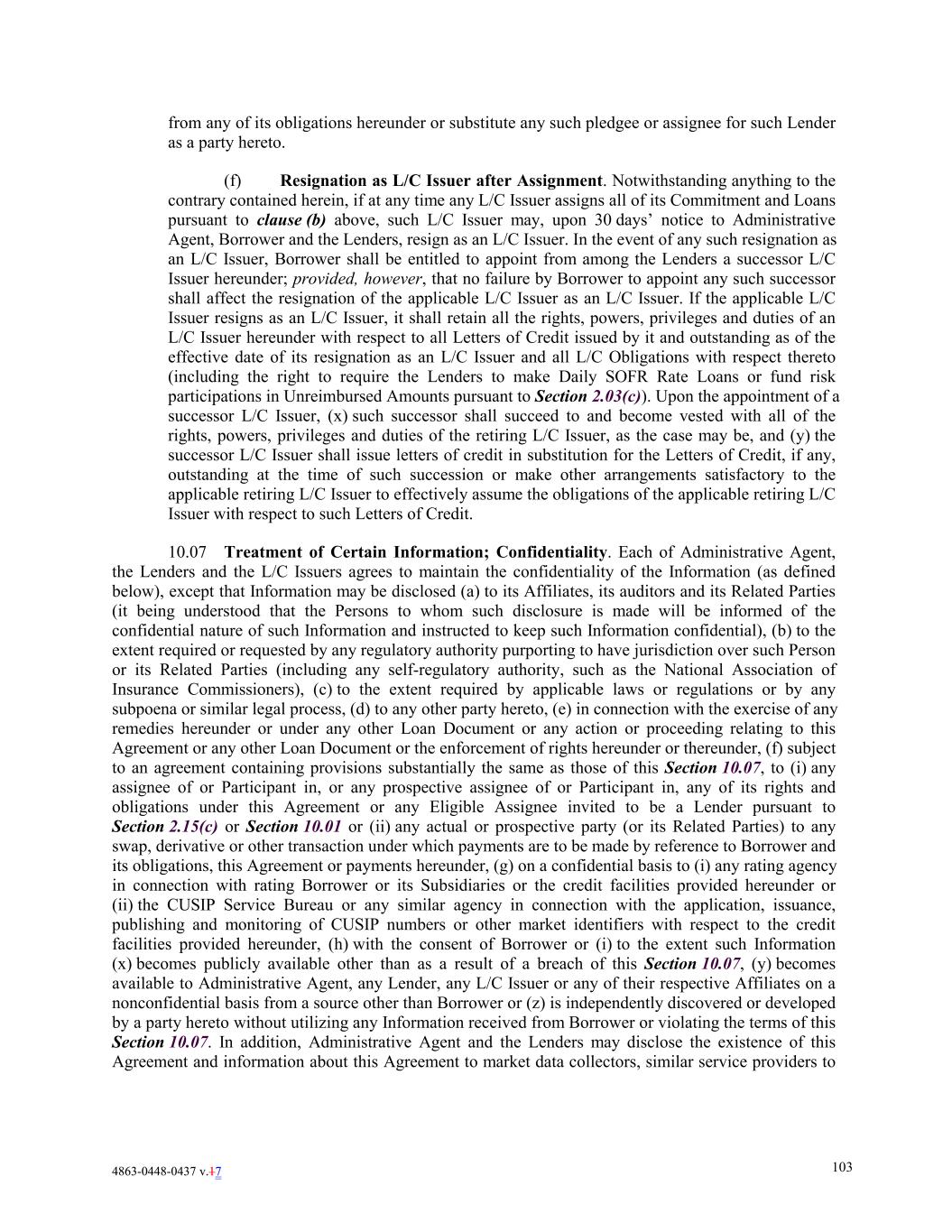4863-0448-0437 v.17 103 from any of its obligations hereunder or substitute any such pledgee or assignee for such Lender as a party hereto. (f) Resignation as L/C Issuer after Assignment. Notwithstanding anything to the contrary contained herein, if at any time any L/C Issuer assigns all of its Commitment and Loans pursuant to clause (b) above, such L/C Issuer may, upon 30 days’ notice to Administrative Agent, Borrower and the Lenders, resign as an L/C Issuer. In the event of any such resignation as an L/C Issuer, Borrower shall be entitled to appoint from among the Lenders a successor L/C Issuer hereunder; provided, however, that no failure by Borrower to appoint any such successor shall affect the resignation of the applicable L/C Issuer as an L/C Issuer. If the applicable L/C Issuer resigns as an L/C Issuer, it shall retain all the rights, powers, privileges and duties of an L/C Issuer hereunder with respect to all Letters of Credit issued by it and outstanding as of the effective date of its resignation as an L/C Issuer and all L/C Obligations with respect thereto (including the right to require the Lenders to make Daily SOFR Rate Loans or fund risk participations in Unreimbursed Amounts pursuant to Section 2.03(c)). Upon the appointment of a successor L/C Issuer, (x) such successor shall succeed to and become vested with all of the rights, powers, privileges and duties of the retiring L/C Issuer, as the case may be, and (y) the successor L/C Issuer shall issue letters of credit in substitution for the Letters of Credit, if any, outstanding at the time of such succession or make other arrangements satisfactory to the applicable retiring L/C Issuer to effectively assume the obligations of the applicable retiring L/C Issuer with respect to such Letters of Credit. 10.07 Treatment of Certain Information; Confidentiality. Each of Administrative Agent, the Lenders and the L/C Issuers agrees to maintain the confidentiality of the Information (as defined below), except that Information may be disclosed (a) to its Affiliates, its auditors and its Related Parties (it being understood that the Persons to whom such disclosure is made will be informed of the confidential nature of such Information and instructed to keep such Information confidential), (b) to the extent required or requested by any regulatory authority purporting to have jurisdiction over such Person or its Related Parties (including any self-regulatory authority, such as the National Association of Insurance Commissioners), (c) to the extent required by applicable laws or regulations or by any subpoena or similar legal process, (d) to any other party hereto, (e) in connection with the exercise of any remedies hereunder or under any other Loan Document or any action or proceeding relating to this Agreement or any other Loan Document or the enforcement of rights hereunder or thereunder, (f) subject to an agreement containing provisions substantially the same as those of this Section 10.07, to (i) any assignee of or Participant in, or any prospective assignee of or Participant in, any of its rights and obligations under this Agreement or any Eligible Assignee invited to be a Lender pursuant to Section 2.15(c) or Section 10.01 or (ii) any actual or prospective party (or its Related Parties) to any swap, derivative or other transaction under which payments are to be made by reference to Borrower and its obligations, this Agreement or payments hereunder, (g) on a confidential basis to (i) any rating agency in connection with rating Borrower or its Subsidiaries or the credit facilities provided hereunder or (ii) the CUSIP Service Bureau or any similar agency in connection with the application, issuance, publishing and monitoring of CUSIP numbers or other market identifiers with respect to the credit facilities provided hereunder, (h) with the consent of Borrower or (i) to the extent such Information (x) becomes publicly available other than as a result of a breach of this Section 10.07, (y) becomes available to Administrative Agent, any Lender, any L/C Issuer or any of their respective Affiliates on a nonconfidential basis from a source other than Borrower or (z) is independently discovered or developed by a party hereto without utilizing any Information received from Borrower or violating the terms of this Section 10.07. In addition, Administrative Agent and the Lenders may disclose the existence of this Agreement and information about this Agreement to market data collectors, similar service providers to