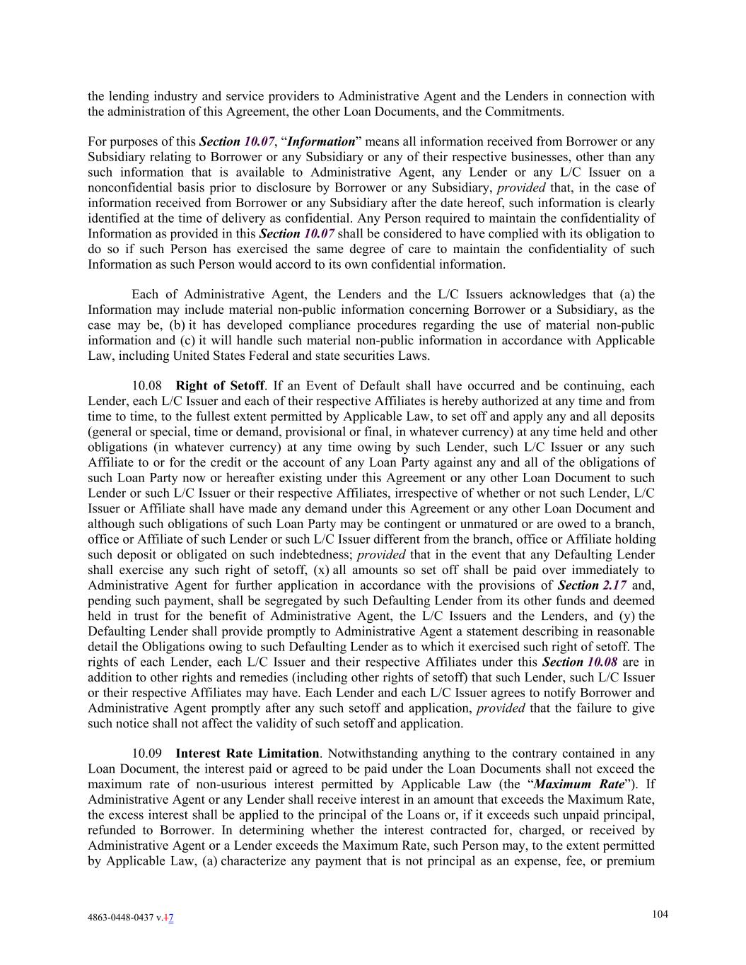 4863-0448-0437 v.17 104 the lending industry and service providers to Administrative Agent and the Lenders in connection with the administration of this Agreement, the other Loan Documents, and the Commitments. For purposes of this Section 10.07, “Information” means all information received from Borrower or any Subsidiary relating to Borrower or any Subsidiary or any of their respective businesses, other than any such information that is available to Administrative Agent, any Lender or any L/C Issuer on a nonconfidential basis prior to disclosure by Borrower or any Subsidiary, provided that, in the case of information received from Borrower or any Subsidiary after the date hereof, such information is clearly identified at the time of delivery as confidential. Any Person required to maintain the confidentiality of Information as provided in this Section 10.07 shall be considered to have complied with its obligation to do so if such Person has exercised the same degree of care to maintain the confidentiality of such Information as such Person would accord to its own confidential information. Each of Administrative Agent, the Lenders and the L/C Issuers acknowledges that (a) the Information may include material non-public information concerning Borrower or a Subsidiary, as the case may be, (b) it has developed compliance procedures regarding the use of material non-public information and (c) it will handle such material non-public information in accordance with Applicable Law, including United States Federal and state securities Laws. 10.08 Right of Setoff. If an Event of Default shall have occurred and be continuing, each Lender, each L/C Issuer and each of their respective Affiliates is hereby authorized at any time and from time to time, to the fullest extent permitted by Applicable Law, to set off and apply any and all deposits (general or special, time or demand, provisional or final, in whatever currency) at any time held and other obligations (in whatever currency) at any time owing by such Lender, such L/C Issuer or any such Affiliate to or for the credit or the account of any Loan Party against any and all of the obligations of such Loan Party now or hereafter existing under this Agreement or any other Loan Document to such Lender or such L/C Issuer or their respective Affiliates, irrespective of whether or not such Lender, L/C Issuer or Affiliate shall have made any demand under this Agreement or any other Loan Document and although such obligations of such Loan Party may be contingent or unmatured or are owed to a branch, office or Affiliate of such Lender or such L/C Issuer different from the branch, office or Affiliate holding such deposit or obligated on such indebtedness; provided that in the event that any Defaulting Lender shall exercise any such right of setoff, (x) all amounts so set off shall be paid over immediately to Administrative Agent for further application in accordance with the provisions of Section 2.17 and, pending such payment, shall be segregated by such Defaulting Lender from its other funds and deemed held in trust for the benefit of Administrative Agent, the L/C Issuers and the Lenders, and (y) the Defaulting Lender shall provide promptly to Administrative Agent a statement describing in reasonable detail the Obligations owing to such Defaulting Lender as to which it exercised such right of setoff. The rights of each Lender, each L/C Issuer and their respective Affiliates under this Section 10.08 are in addition to other rights and remedies (including other rights of setoff) that such Lender, such L/C Issuer or their respective Affiliates may have. Each Lender and each L/C Issuer agrees to notify Borrower and Administrative Agent promptly after any such setoff and application, provided that the failure to give such notice shall not affect the validity of such setoff and application. 10.09 Interest Rate Limitation. Notwithstanding anything to the contrary contained in any Loan Document, the interest paid or agreed to be paid under the Loan Documents shall not exceed the maximum rate of non-usurious interest permitted by Applicable Law (the “Maximum Rate”). If Administrative Agent or any Lender shall receive interest in an amount that exceeds the Maximum Rate, the excess interest shall be applied to the principal of the Loans or, if it exceeds such unpaid principal, refunded to Borrower. In determining whether the interest contracted for, charged, or received by Administrative Agent or a Lender exceeds the Maximum Rate, such Person may, to the extent permitted by Applicable Law, (a) characterize any payment that is not principal as an expense, fee, or premium