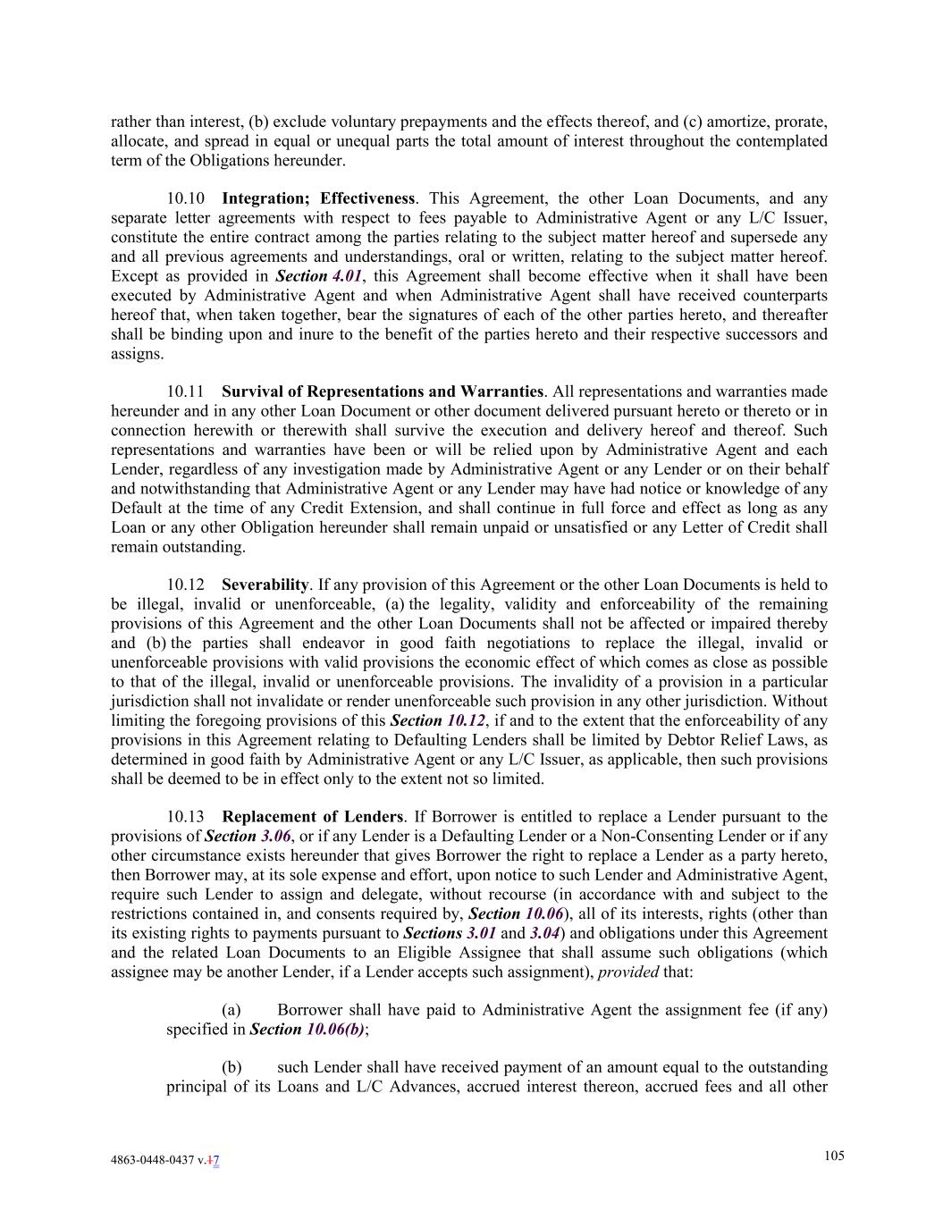 4863-0448-0437 v.17 105 rather than interest, (b) exclude voluntary prepayments and the effects thereof, and (c) amortize, prorate, allocate, and spread in equal or unequal parts the total amount of interest throughout the contemplated term of the Obligations hereunder. 10.10 Integration; Effectiveness. This Agreement, the other Loan Documents, and any separate letter agreements with respect to fees payable to Administrative Agent or any L/C Issuer, constitute the entire contract among the parties relating to the subject matter hereof and supersede any and all previous agreements and understandings, oral or written, relating to the subject matter hereof. Except as provided in Section 4.01, this Agreement shall become effective when it shall have been executed by Administrative Agent and when Administrative Agent shall have received counterparts hereof that, when taken together, bear the signatures of each of the other parties hereto, and thereafter shall be binding upon and inure to the benefit of the parties hereto and their respective successors and assigns. 10.11 Survival of Representations and Warranties. All representations and warranties made hereunder and in any other Loan Document or other document delivered pursuant hereto or thereto or in connection herewith or therewith shall survive the execution and delivery hereof and thereof. Such representations and warranties have been or will be relied upon by Administrative Agent and each Lender, regardless of any investigation made by Administrative Agent or any Lender or on their behalf and notwithstanding that Administrative Agent or any Lender may have had notice or knowledge of any Default at the time of any Credit Extension, and shall continue in full force and effect as long as any Loan or any other Obligation hereunder shall remain unpaid or unsatisfied or any Letter of Credit shall remain outstanding. 10.12 Severability. If any provision of this Agreement or the other Loan Documents is held to be illegal, invalid or unenforceable, (a) the legality, validity and enforceability of the remaining provisions of this Agreement and the other Loan Documents shall not be affected or impaired thereby and (b) the parties shall endeavor in good faith negotiations to replace the illegal, invalid or unenforceable provisions with valid provisions the economic effect of which comes as close as possible to that of the illegal, invalid or unenforceable provisions. The invalidity of a provision in a particular jurisdiction shall not invalidate or render unenforceable such provision in any other jurisdiction. Without limiting the foregoing provisions of this Section 10.12, if and to the extent that the enforceability of any provisions in this Agreement relating to Defaulting Lenders shall be limited by Debtor Relief Laws, as determined in good faith by Administrative Agent or any L/C Issuer, as applicable, then such provisions shall be deemed to be in effect only to the extent not so limited. 10.13 Replacement of Lenders. If Borrower is entitled to replace a Lender pursuant to the provisions of Section 3.06, or if any Lender is a Defaulting Lender or a Non-Consenting Lender or if any other circumstance exists hereunder that gives Borrower the right to replace a Lender as a party hereto, then Borrower may, at its sole expense and effort, upon notice to such Lender and Administrative Agent, require such Lender to assign and delegate, without recourse (in accordance with and subject to the restrictions contained in, and consents required by, Section 10.06), all of its interests, rights (other than its existing rights to payments pursuant to Sections 3.01 and 3.04) and obligations under this Agreement and the related Loan Documents to an Eligible Assignee that shall assume such obligations (which assignee may be another Lender, if a Lender accepts such assignment), provided that: (a) Borrower shall have paid to Administrative Agent the assignment fee (if any) specified in Section 10.06(b); (b) such Lender shall have received payment of an amount equal to the outstanding principal of its Loans and L/C Advances, accrued interest thereon, accrued fees and all other