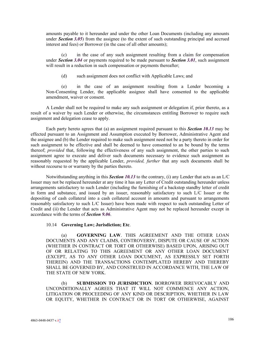 4863-0448-0437 v.17 106 amounts payable to it hereunder and under the other Loan Documents (including any amounts under Section 3.05) from the assignee (to the extent of such outstanding principal and accrued interest and fees) or Borrower (in the case of all other amounts); (c) in the case of any such assignment resulting from a claim for compensation under Section 3.04 or payments required to be made pursuant to Section 3.01, such assignment will result in a reduction in such compensation or payments thereafter; (d) such assignment does not conflict with Applicable Laws; and (e) in the case of an assignment resulting from a Lender becoming a Non-Consenting Lender, the applicable assignee shall have consented to the applicable amendment, waiver or consent. A Lender shall not be required to make any such assignment or delegation if, prior thereto, as a result of a waiver by such Lender or otherwise, the circumstances entitling Borrower to require such assignment and delegation cease to apply. Each party hereto agrees that (a) an assignment required pursuant to this Section 10.13 may be effected pursuant to an Assignment and Assumption executed by Borrower, Administrative Agent and the assignee and (b) the Lender required to make such assignment need not be a party thereto in order for such assignment to be effective and shall be deemed to have consented to an be bound by the terms thereof; provided that, following the effectiveness of any such assignment, the other parties to such assignment agree to execute and deliver such documents necessary to evidence such assignment as reasonably requested by the applicable Lender, provided, further that any such documents shall be without recourse to or warranty by the parties thereto. Notwithstanding anything in this Section 10.13 to the contrary, (i) any Lender that acts as an L/C Issuer may not be replaced hereunder at any time it has any Letter of Credit outstanding hereunder unless arrangements satisfactory to such Lender (including the furnishing of a backstop standby letter of credit in form and substance, and issued by an issuer, reasonably satisfactory to such L/C Issuer or the depositing of cash collateral into a cash collateral account in amounts and pursuant to arrangements reasonably satisfactory to such L/C Issuer) have been made with respect to such outstanding Letter of Credit and (ii) the Lender that acts as Administrative Agent may not be replaced hereunder except in accordance with the terms of Section 9.06. 10.14 Governing Law; Jurisdiction; Etc. (a) GOVERNING LAW. THIS AGREEMENT AND THE OTHER LOAN DOCUMENTS AND ANY CLAIMS, CONTROVERSY, DISPUTE OR CAUSE OF ACTION (WHETHER IN CONTRACT OR TORT OR OTHERWISE) BASED UPON, ARISING OUT OF OR RELATING TO THIS AGREEMENT OR ANY OTHER LOAN DOCUMENT (EXCEPT, AS TO ANY OTHER LOAN DOCUMENT, AS EXPRESSLY SET FORTH THEREIN) AND THE TRANSACTIONS CONTEMPLATED HEREBY AND THEREBY SHALL BE GOVERNED BY, AND CONSTRUED IN ACCORDANCE WITH, THE LAW OF THE STATE OF NEW YORK. (b) SUBMISSION TO JURISDICTION. BORROWER IRREVOCABLY AND UNCONDITIONALLY AGREES THAT IT WILL NOT COMMENCE ANY ACTION, LITIGATION OR PROCEEDING OF ANY KIND OR DESCRIPTION, WHETHER IN LAW OR EQUITY, WHETHER IN CONTRACT OR IN TORT OR OTHERWISE, AGAINST