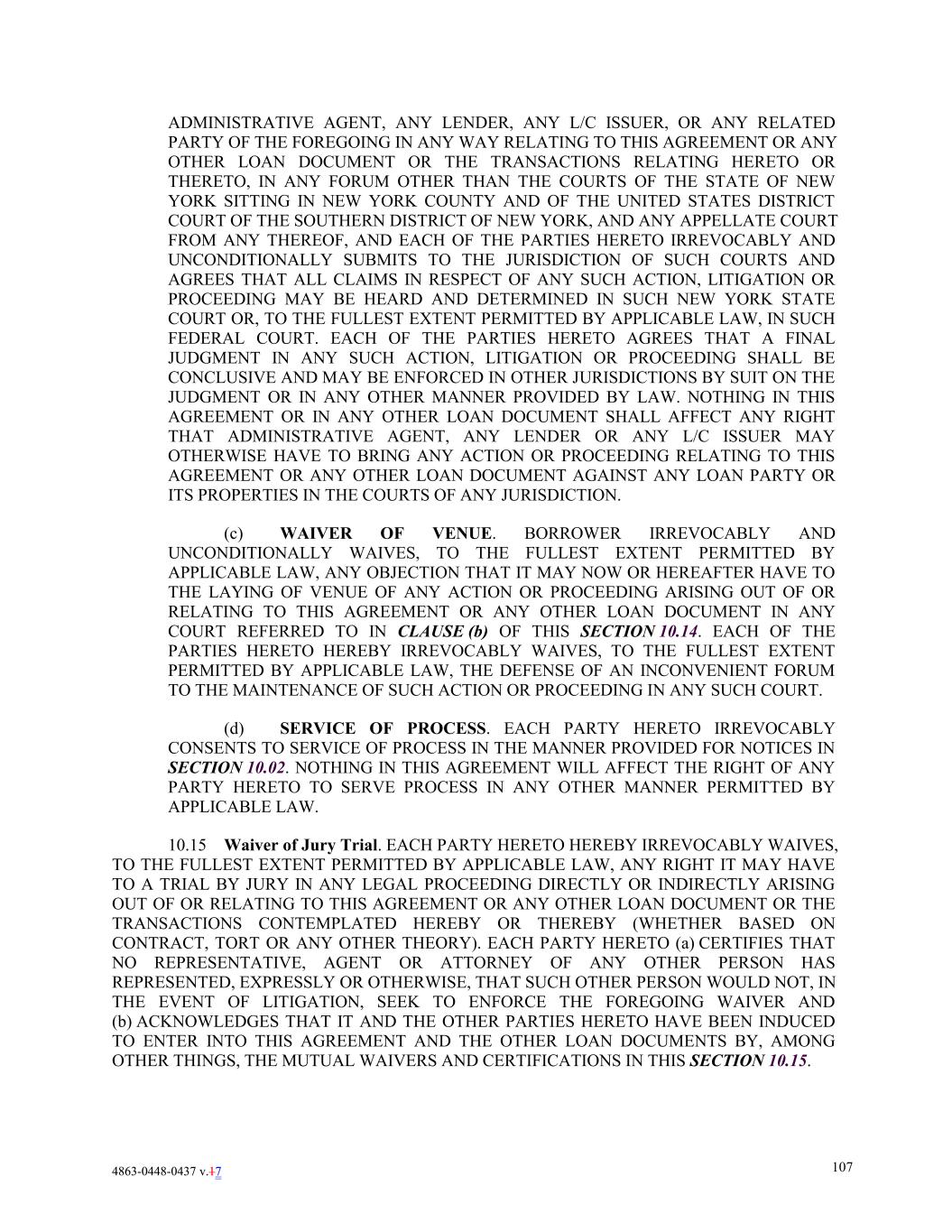 4863-0448-0437 v.17 107 ADMINISTRATIVE AGENT, ANY LENDER, ANY L/C ISSUER, OR ANY RELATED PARTY OF THE FOREGOING IN ANY WAY RELATING TO THIS AGREEMENT OR ANY OTHER LOAN DOCUMENT OR THE TRANSACTIONS RELATING HERETO OR THERETO, IN ANY FORUM OTHER THAN THE COURTS OF THE STATE OF NEW YORK SITTING IN NEW YORK COUNTY AND OF THE UNITED STATES DISTRICT COURT OF THE SOUTHERN DISTRICT OF NEW YORK, AND ANY APPELLATE COURT FROM ANY THEREOF, AND EACH OF THE PARTIES HERETO IRREVOCABLY AND UNCONDITIONALLY SUBMITS TO THE JURISDICTION OF SUCH COURTS AND AGREES THAT ALL CLAIMS IN RESPECT OF ANY SUCH ACTION, LITIGATION OR PROCEEDING MAY BE HEARD AND DETERMINED IN SUCH NEW YORK STATE COURT OR, TO THE FULLEST EXTENT PERMITTED BY APPLICABLE LAW, IN SUCH FEDERAL COURT. EACH OF THE PARTIES HERETO AGREES THAT A FINAL JUDGMENT IN ANY SUCH ACTION, LITIGATION OR PROCEEDING SHALL BE CONCLUSIVE AND MAY BE ENFORCED IN OTHER JURISDICTIONS BY SUIT ON THE JUDGMENT OR IN ANY OTHER MANNER PROVIDED BY LAW. NOTHING IN THIS AGREEMENT OR IN ANY OTHER LOAN DOCUMENT SHALL AFFECT ANY RIGHT THAT ADMINISTRATIVE AGENT, ANY LENDER OR ANY L/C ISSUER MAY OTHERWISE HAVE TO BRING ANY ACTION OR PROCEEDING RELATING TO THIS AGREEMENT OR ANY OTHER LOAN DOCUMENT AGAINST ANY LOAN PARTY OR ITS PROPERTIES IN THE COURTS OF ANY JURISDICTION. (c) WAIVER OF VENUE. BORROWER IRREVOCABLY AND UNCONDITIONALLY WAIVES, TO THE FULLEST EXTENT PERMITTED BY APPLICABLE LAW, ANY OBJECTION THAT IT MAY NOW OR HEREAFTER HAVE TO THE LAYING OF VENUE OF ANY ACTION OR PROCEEDING ARISING OUT OF OR RELATING TO THIS AGREEMENT OR ANY OTHER LOAN DOCUMENT IN ANY COURT REFERRED TO IN CLAUSE (b) OF THIS SECTION 10.14. EACH OF THE PARTIES HERETO HEREBY IRREVOCABLY WAIVES, TO THE FULLEST EXTENT PERMITTED BY APPLICABLE LAW, THE DEFENSE OF AN INCONVENIENT FORUM TO THE MAINTENANCE OF SUCH ACTION OR PROCEEDING IN ANY SUCH COURT. (d) SERVICE OF PROCESS. EACH PARTY HERETO IRREVOCABLY CONSENTS TO SERVICE OF PROCESS IN THE MANNER PROVIDED FOR NOTICES IN SECTION 10.02. NOTHING IN THIS AGREEMENT WILL AFFECT THE RIGHT OF ANY PARTY HERETO TO SERVE PROCESS IN ANY OTHER MANNER PERMITTED BY APPLICABLE LAW. 10.15 Waiver of Jury Trial. EACH PARTY HERETO HEREBY IRREVOCABLY WAIVES, TO THE FULLEST EXTENT PERMITTED BY APPLICABLE LAW, ANY RIGHT IT MAY HAVE TO A TRIAL BY JURY IN ANY LEGAL PROCEEDING DIRECTLY OR INDIRECTLY ARISING OUT OF OR RELATING TO THIS AGREEMENT OR ANY OTHER LOAN DOCUMENT OR THE TRANSACTIONS CONTEMPLATED HEREBY OR THEREBY (WHETHER BASED ON CONTRACT, TORT OR ANY OTHER THEORY). EACH PARTY HERETO (a) CERTIFIES THAT NO REPRESENTATIVE, AGENT OR ATTORNEY OF ANY OTHER PERSON HAS REPRESENTED, EXPRESSLY OR OTHERWISE, THAT SUCH OTHER PERSON WOULD NOT, IN THE EVENT OF LITIGATION, SEEK TO ENFORCE THE FOREGOING WAIVER AND (b) ACKNOWLEDGES THAT IT AND THE OTHER PARTIES HERETO HAVE BEEN INDUCED TO ENTER INTO THIS AGREEMENT AND THE OTHER LOAN DOCUMENTS BY, AMONG OTHER THINGS, THE MUTUAL WAIVERS AND CERTIFICATIONS IN THIS SECTION 10.15.