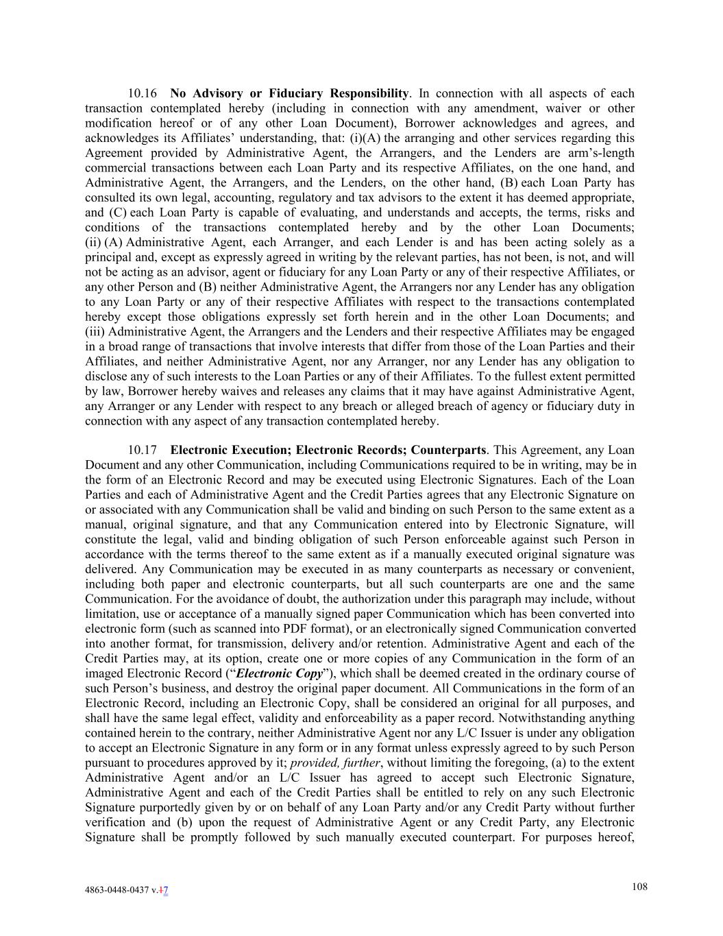 4863-0448-0437 v.17 108 10.16 No Advisory or Fiduciary Responsibility. In connection with all aspects of each transaction contemplated hereby (including in connection with any amendment, waiver or other modification hereof or of any other Loan Document), Borrower acknowledges and agrees, and acknowledges its Affiliates’ understanding, that: (i)(A) the arranging and other services regarding this Agreement provided by Administrative Agent, the Arrangers, and the Lenders are arm’s-length commercial transactions between each Loan Party and its respective Affiliates, on the one hand, and Administrative Agent, the Arrangers, and the Lenders, on the other hand, (B) each Loan Party has consulted its own legal, accounting, regulatory and tax advisors to the extent it has deemed appropriate, and (C) each Loan Party is capable of evaluating, and understands and accepts, the terms, risks and conditions of the transactions contemplated hereby and by the other Loan Documents; (ii) (A) Administrative Agent, each Arranger, and each Lender is and has been acting solely as a principal and, except as expressly agreed in writing by the relevant parties, has not been, is not, and will not be acting as an advisor, agent or fiduciary for any Loan Party or any of their respective Affiliates, or any other Person and (B) neither Administrative Agent, the Arrangers nor any Lender has any obligation to any Loan Party or any of their respective Affiliates with respect to the transactions contemplated hereby except those obligations expressly set forth herein and in the other Loan Documents; and (iii) Administrative Agent, the Arrangers and the Lenders and their respective Affiliates may be engaged in a broad range of transactions that involve interests that differ from those of the Loan Parties and their Affiliates, and neither Administrative Agent, nor any Arranger, nor any Lender has any obligation to disclose any of such interests to the Loan Parties or any of their Affiliates. To the fullest extent permitted by law, Borrower hereby waives and releases any claims that it may have against Administrative Agent, any Arranger or any Lender with respect to any breach or alleged breach of agency or fiduciary duty in connection with any aspect of any transaction contemplated hereby. 10.17 Electronic Execution; Electronic Records; Counterparts. This Agreement, any Loan Document and any other Communication, including Communications required to be in writing, may be in the form of an Electronic Record and may be executed using Electronic Signatures. Each of the Loan Parties and each of Administrative Agent and the Credit Parties agrees that any Electronic Signature on or associated with any Communication shall be valid and binding on such Person to the same extent as a manual, original signature, and that any Communication entered into by Electronic Signature, will constitute the legal, valid and binding obligation of such Person enforceable against such Person in accordance with the terms thereof to the same extent as if a manually executed original signature was delivered. Any Communication may be executed in as many counterparts as necessary or convenient, including both paper and electronic counterparts, but all such counterparts are one and the same Communication. For the avoidance of doubt, the authorization under this paragraph may include, without limitation, use or acceptance of a manually signed paper Communication which has been converted into electronic form (such as scanned into PDF format), or an electronically signed Communication converted into another format, for transmission, delivery and/or retention. Administrative Agent and each of the Credit Parties may, at its option, create one or more copies of any Communication in the form of an imaged Electronic Record (“Electronic Copy”), which shall be deemed created in the ordinary course of such Person’s business, and destroy the original paper document. All Communications in the form of an Electronic Record, including an Electronic Copy, shall be considered an original for all purposes, and shall have the same legal effect, validity and enforceability as a paper record. Notwithstanding anything contained herein to the contrary, neither Administrative Agent nor any L/C Issuer is under any obligation to accept an Electronic Signature in any form or in any format unless expressly agreed to by such Person pursuant to procedures approved by it; provided, further, without limiting the foregoing, (a) to the extent Administrative Agent and/or an L/C Issuer has agreed to accept such Electronic Signature, Administrative Agent and each of the Credit Parties shall be entitled to rely on any such Electronic Signature purportedly given by or on behalf of any Loan Party and/or any Credit Party without further verification and (b) upon the request of Administrative Agent or any Credit Party, any Electronic Signature shall be promptly followed by such manually executed counterpart. For purposes hereof,
