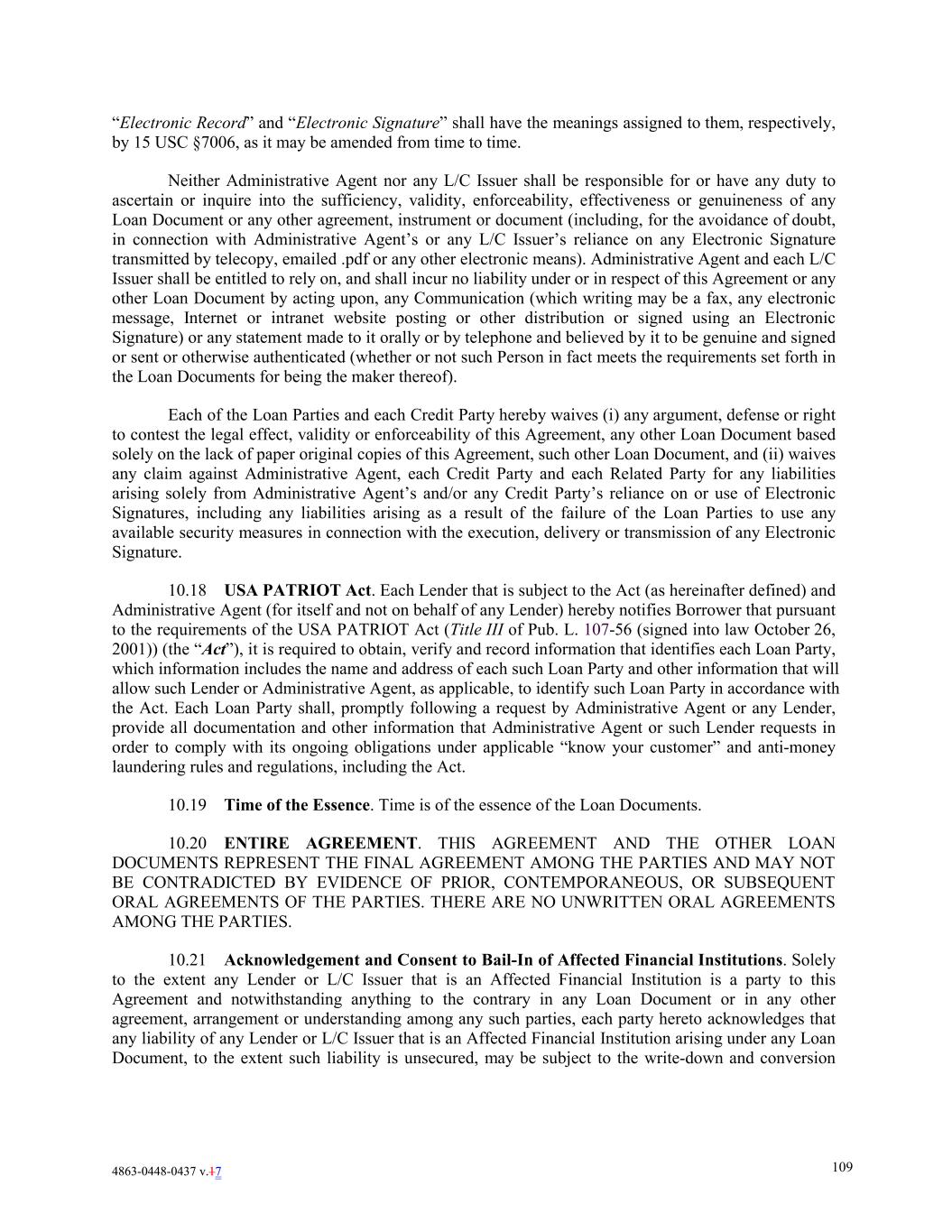 4863-0448-0437 v.17 109 “Electronic Record” and “Electronic Signature” shall have the meanings assigned to them, respectively, by 15 USC §7006, as it may be amended from time to time. Neither Administrative Agent nor any L/C Issuer shall be responsible for or have any duty to ascertain or inquire into the sufficiency, validity, enforceability, effectiveness or genuineness of any Loan Document or any other agreement, instrument or document (including, for the avoidance of doubt, in connection with Administrative Agent’s or any L/C Issuer’s reliance on any Electronic Signature transmitted by telecopy, emailed .pdf or any other electronic means). Administrative Agent and each L/C Issuer shall be entitled to rely on, and shall incur no liability under or in respect of this Agreement or any other Loan Document by acting upon, any Communication (which writing may be a fax, any electronic message, Internet or intranet website posting or other distribution or signed using an Electronic Signature) or any statement made to it orally or by telephone and believed by it to be genuine and signed or sent or otherwise authenticated (whether or not such Person in fact meets the requirements set forth in the Loan Documents for being the maker thereof). Each of the Loan Parties and each Credit Party hereby waives (i) any argument, defense or right to contest the legal effect, validity or enforceability of this Agreement, any other Loan Document based solely on the lack of paper original copies of this Agreement, such other Loan Document, and (ii) waives any claim against Administrative Agent, each Credit Party and each Related Party for any liabilities arising solely from Administrative Agent’s and/or any Credit Party’s reliance on or use of Electronic Signatures, including any liabilities arising as a result of the failure of the Loan Parties to use any available security measures in connection with the execution, delivery or transmission of any Electronic Signature. 10.18 USA PATRIOT Act. Each Lender that is subject to the Act (as hereinafter defined) and Administrative Agent (for itself and not on behalf of any Lender) hereby notifies Borrower that pursuant to the requirements of the USA PATRIOT Act (Title III of Pub. L. 107-56 (signed into law October 26, 2001)) (the “Act”), it is required to obtain, verify and record information that identifies each Loan Party, which information includes the name and address of each such Loan Party and other information that will allow such Lender or Administrative Agent, as applicable, to identify such Loan Party in accordance with the Act. Each Loan Party shall, promptly following a request by Administrative Agent or any Lender, provide all documentation and other information that Administrative Agent or such Lender requests in order to comply with its ongoing obligations under applicable “know your customer” and anti-money laundering rules and regulations, including the Act. 10.19 Time of the Essence. Time is of the essence of the Loan Documents. 10.20 ENTIRE AGREEMENT. THIS AGREEMENT AND THE OTHER LOAN DOCUMENTS REPRESENT THE FINAL AGREEMENT AMONG THE PARTIES AND MAY NOT BE CONTRADICTED BY EVIDENCE OF PRIOR, CONTEMPORANEOUS, OR SUBSEQUENT ORAL AGREEMENTS OF THE PARTIES. THERE ARE NO UNWRITTEN ORAL AGREEMENTS AMONG THE PARTIES. 10.21 Acknowledgement and Consent to Bail-In of Affected Financial Institutions. Solely to the extent any Lender or L/C Issuer that is an Affected Financial Institution is a party to this Agreement and notwithstanding anything to the contrary in any Loan Document or in any other agreement, arrangement or understanding among any such parties, each party hereto acknowledges that any liability of any Lender or L/C Issuer that is an Affected Financial Institution arising under any Loan Document, to the extent such liability is unsecured, may be subject to the write-down and conversion