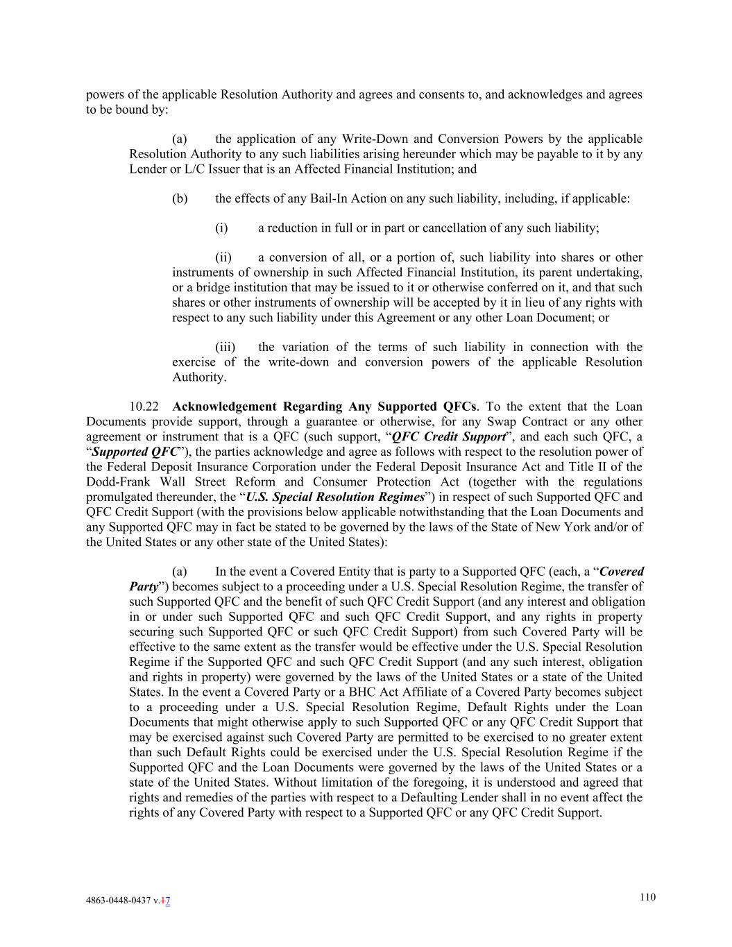 4863-0448-0437 v.17 110 powers of the applicable Resolution Authority and agrees and consents to, and acknowledges and agrees to be bound by: (a) the application of any Write-Down and Conversion Powers by the applicable Resolution Authority to any such liabilities arising hereunder which may be payable to it by any Lender or L/C Issuer that is an Affected Financial Institution; and (b) the effects of any Bail-In Action on any such liability, including, if applicable: (i) a reduction in full or in part or cancellation of any such liability; (ii) a conversion of all, or a portion of, such liability into shares or other instruments of ownership in such Affected Financial Institution, its parent undertaking, or a bridge institution that may be issued to it or otherwise conferred on it, and that such shares or other instruments of ownership will be accepted by it in lieu of any rights with respect to any such liability under this Agreement or any other Loan Document; or (iii) the variation of the terms of such liability in connection with the exercise of the write-down and conversion powers of the applicable Resolution Authority. 10.22 Acknowledgement Regarding Any Supported QFCs. To the extent that the Loan Documents provide support, through a guarantee or otherwise, for any Swap Contract or any other agreement or instrument that is a QFC (such support, “QFC Credit Support”, and each such QFC, a “Supported QFC”), the parties acknowledge and agree as follows with respect to the resolution power of the Federal Deposit Insurance Corporation under the Federal Deposit Insurance Act and Title II of the Dodd-Frank Wall Street Reform and Consumer Protection Act (together with the regulations promulgated thereunder, the “U.S. Special Resolution Regimes”) in respect of such Supported QFC and QFC Credit Support (with the provisions below applicable notwithstanding that the Loan Documents and any Supported QFC may in fact be stated to be governed by the laws of the State of New York and/or of the United States or any other state of the United States): (a) In the event a Covered Entity that is party to a Supported QFC (each, a “Covered Party”) becomes subject to a proceeding under a U.S. Special Resolution Regime, the transfer of such Supported QFC and the benefit of such QFC Credit Support (and any interest and obligation in or under such Supported QFC and such QFC Credit Support, and any rights in property securing such Supported QFC or such QFC Credit Support) from such Covered Party will be effective to the same extent as the transfer would be effective under the U.S. Special Resolution Regime if the Supported QFC and such QFC Credit Support (and any such interest, obligation and rights in property) were governed by the laws of the United States or a state of the United States. In the event a Covered Party or a BHC Act Affiliate of a Covered Party becomes subject to a proceeding under a U.S. Special Resolution Regime, Default Rights under the Loan Documents that might otherwise apply to such Supported QFC or any QFC Credit Support that may be exercised against such Covered Party are permitted to be exercised to no greater extent than such Default Rights could be exercised under the U.S. Special Resolution Regime if the Supported QFC and the Loan Documents were governed by the laws of the United States or a state of the United States. Without limitation of the foregoing, it is understood and agreed that rights and remedies of the parties with respect to a Defaulting Lender shall in no event affect the rights of any Covered Party with respect to a Supported QFC or any QFC Credit Support.