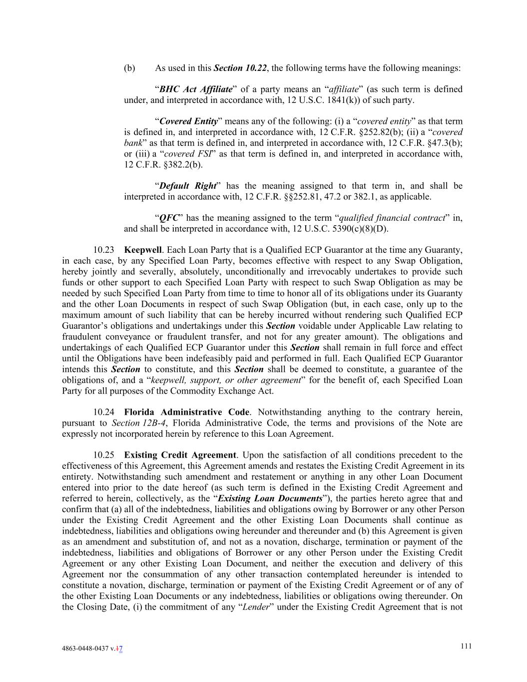 4863-0448-0437 v.17 111 (b) As used in this Section 10.22, the following terms have the following meanings: “BHC Act Affiliate” of a party means an “affiliate” (as such term is defined under, and interpreted in accordance with, 12 U.S.C. 1841(k)) of such party. “Covered Entity” means any of the following: (i) a “covered entity” as that term is defined in, and interpreted in accordance with, 12 C.F.R. §252.82(b); (ii) a “covered bank” as that term is defined in, and interpreted in accordance with, 12 C.F.R. §47.3(b); or (iii) a “covered FSI” as that term is defined in, and interpreted in accordance with, 12 C.F.R. §382.2(b). “Default Right” has the meaning assigned to that term in, and shall be interpreted in accordance with, 12 C.F.R. §§252.81, 47.2 or 382.1, as applicable. “QFC” has the meaning assigned to the term “qualified financial contract” in, and shall be interpreted in accordance with, 12 U.S.C. 5390(c)(8)(D). 10.23 Keepwell. Each Loan Party that is a Qualified ECP Guarantor at the time any Guaranty, in each case, by any Specified Loan Party, becomes effective with respect to any Swap Obligation, hereby jointly and severally, absolutely, unconditionally and irrevocably undertakes to provide such funds or other support to each Specified Loan Party with respect to such Swap Obligation as may be needed by such Specified Loan Party from time to time to honor all of its obligations under its Guaranty and the other Loan Documents in respect of such Swap Obligation (but, in each case, only up to the maximum amount of such liability that can be hereby incurred without rendering such Qualified ECP Guarantor’s obligations and undertakings under this Section voidable under Applicable Law relating to fraudulent conveyance or fraudulent transfer, and not for any greater amount). The obligations and undertakings of each Qualified ECP Guarantor under this Section shall remain in full force and effect until the Obligations have been indefeasibly paid and performed in full. Each Qualified ECP Guarantor intends this Section to constitute, and this Section shall be deemed to constitute, a guarantee of the obligations of, and a “keepwell, support, or other agreement” for the benefit of, each Specified Loan Party for all purposes of the Commodity Exchange Act. 10.24 Florida Administrative Code. Notwithstanding anything to the contrary herein, pursuant to Section 12B-4, Florida Administrative Code, the terms and provisions of the Note are expressly not incorporated herein by reference to this Loan Agreement. 10.25 Existing Credit Agreement. Upon the satisfaction of all conditions precedent to the effectiveness of this Agreement, this Agreement amends and restates the Existing Credit Agreement in its entirety. Notwithstanding such amendment and restatement or anything in any other Loan Document entered into prior to the date hereof (as such term is defined in the Existing Credit Agreement and referred to herein, collectively, as the “Existing Loan Documents”), the parties hereto agree that and confirm that (a) all of the indebtedness, liabilities and obligations owing by Borrower or any other Person under the Existing Credit Agreement and the other Existing Loan Documents shall continue as indebtedness, liabilities and obligations owing hereunder and thereunder and (b) this Agreement is given as an amendment and substitution of, and not as a novation, discharge, termination or payment of the indebtedness, liabilities and obligations of Borrower or any other Person under the Existing Credit Agreement or any other Existing Loan Document, and neither the execution and delivery of this Agreement nor the consummation of any other transaction contemplated hereunder is intended to constitute a novation, discharge, termination or payment of the Existing Credit Agreement or of any of the other Existing Loan Documents or any indebtedness, liabilities or obligations owing thereunder. On the Closing Date, (i) the commitment of any “Lender” under the Existing Credit Agreement that is not