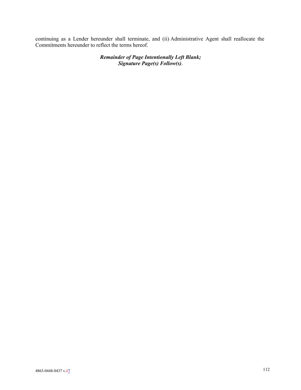 4863-0448-0437 v.17 112 continuing as a Lender hereunder shall terminate, and (ii) Administrative Agent shall reallocate the Commitments hereunder to reflect the terms hereof. Remainder of Page Intentionally Left Blank; Signature Page(s) Follow(s).