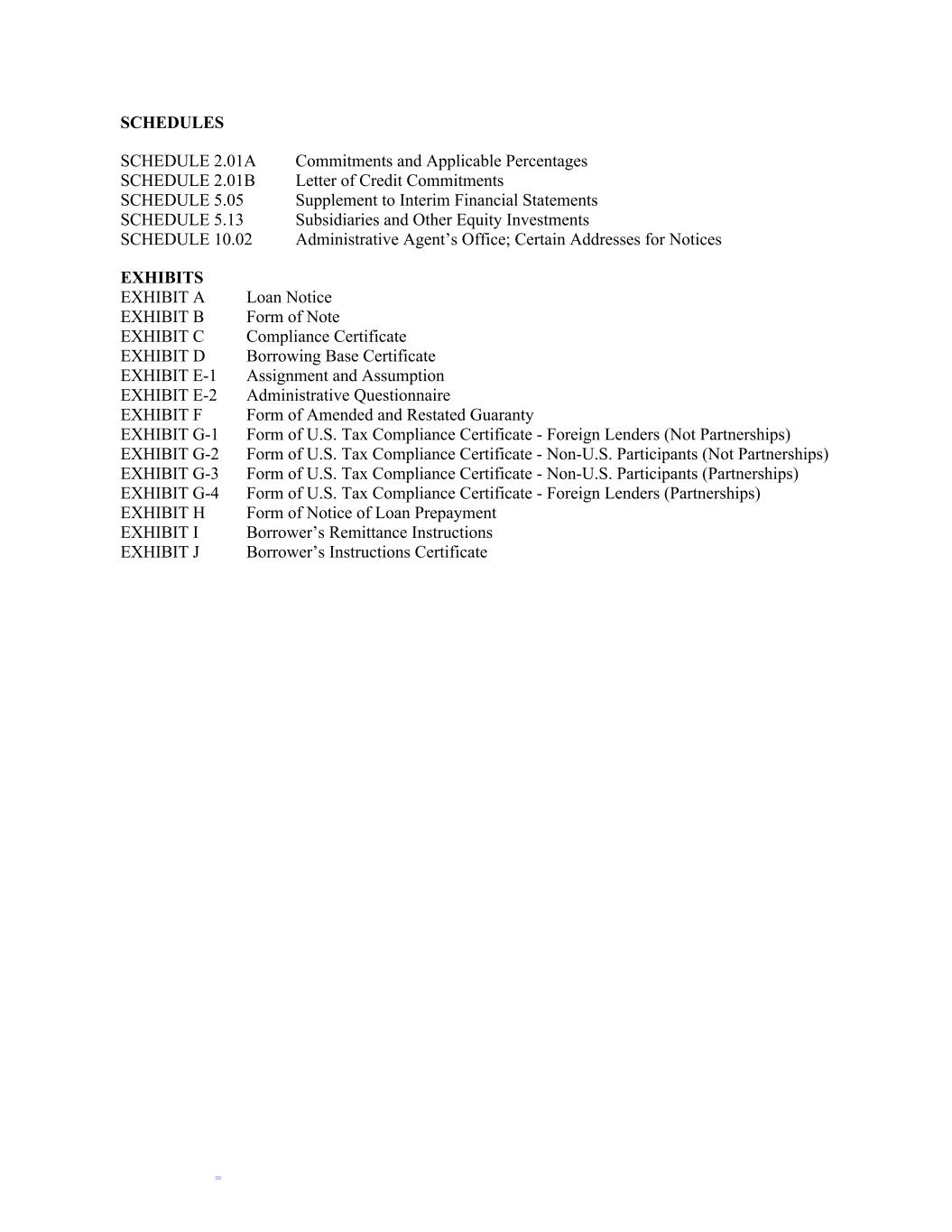 EXHIBIT E-1 SCHEDULE 10.02 Assignment and Assumption Administrative Agent’s Office; Certain Addresses for Notices EXHIBIT E-2 Letter of Credit Commitments Administrative Questionnaire EXHIBIT F EXHIBITS Form of Amended and Restated Guaranty EXHIBIT G-1 SCHEDULE 2.01A Form of U.S. Tax Compliance Certificate - Foreign Lenders (Not Partnerships) EXHIBIT A SCHEDULE 5.05 EXHIBIT G-2 Loan Notice Form of U.S. Tax Compliance Certificate - Non-U.S. Participants (Not Partnerships) EXHIBIT G-3 Supplement to Interim Financial Statements Form of U.S. Tax Compliance Certificate - Non-U.S. Participants (Partnerships) EXHIBIT B Commitments and Applicable Percentages EXHIBIT G-4 Form of Note Form of U.S. Tax Compliance Certificate - Foreign Lenders (Partnerships) EXHIBIT H SCHEDULES Form of Notice of Loan Prepayment EXHIBIT C SCHEDULE 5.13 EXHIBIT I Compliance Certificate Borrower’s Remittance Instructions EXHIBIT J Subsidiaries and Other Equity Investments Borrower’s Instructions Certificate EXHIBIT D Borrowing Base Certificate SCHEDULE 2.01B